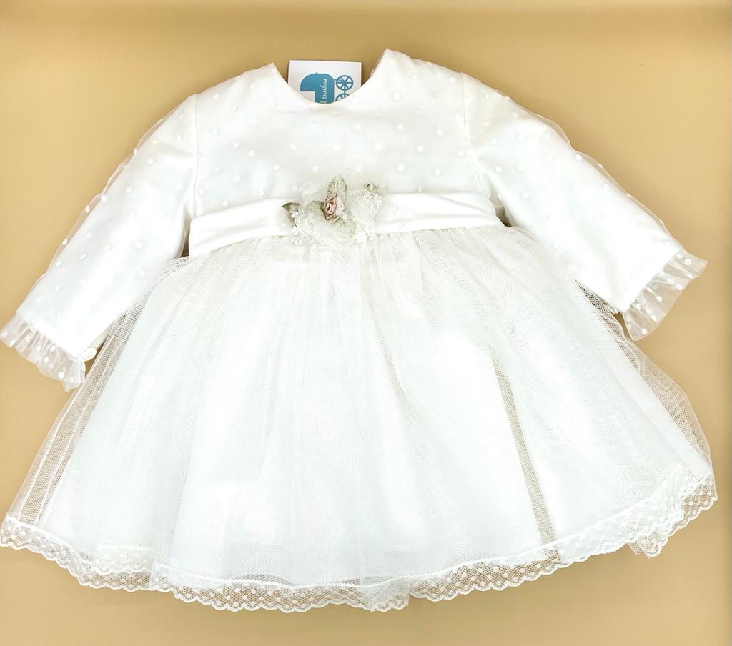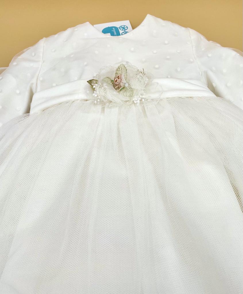 Meraviglioso abito a manica lunga cerimonia bianco latte con dettaglio in vita con fiori.