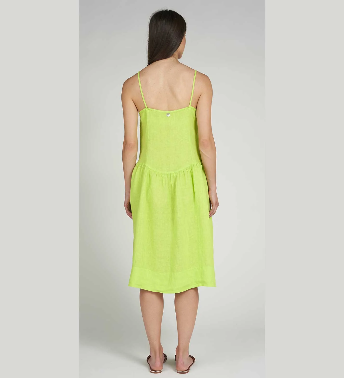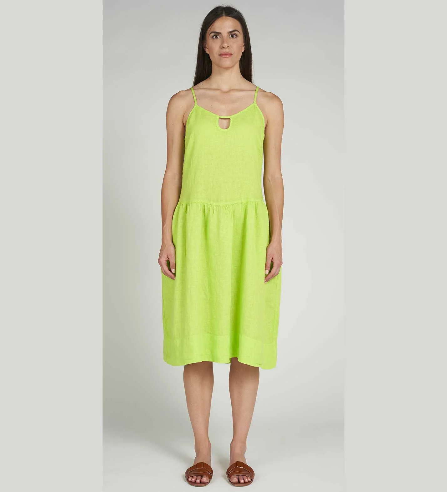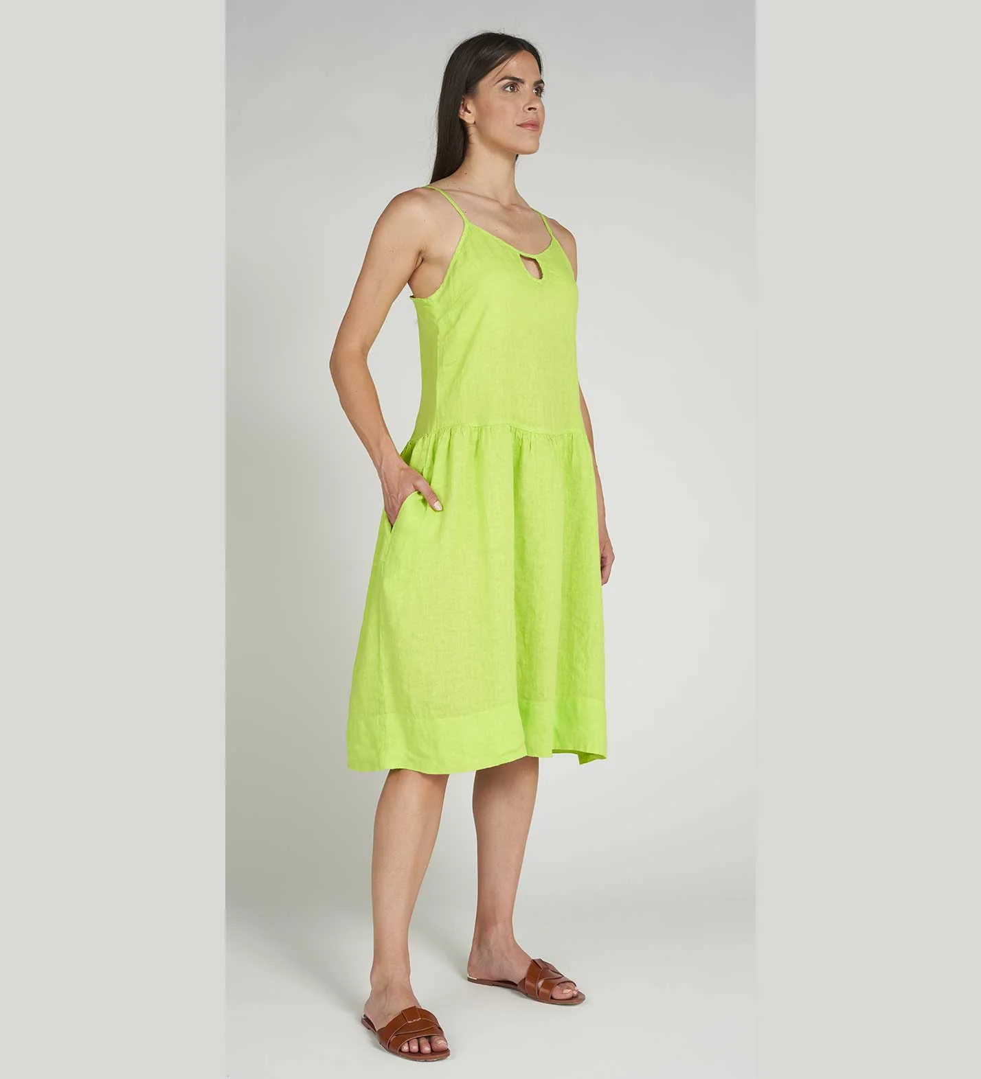 Abito freschissimo in puro lino con spalline e piccola goccia sul davanti. Taglio vita con leggero arriccio e tasche laterali. Lunghezza sotto il ginocchio. Vestibilità morbida. Colore: Verde Cedro. Tessuto 100% Lino Made in Italy