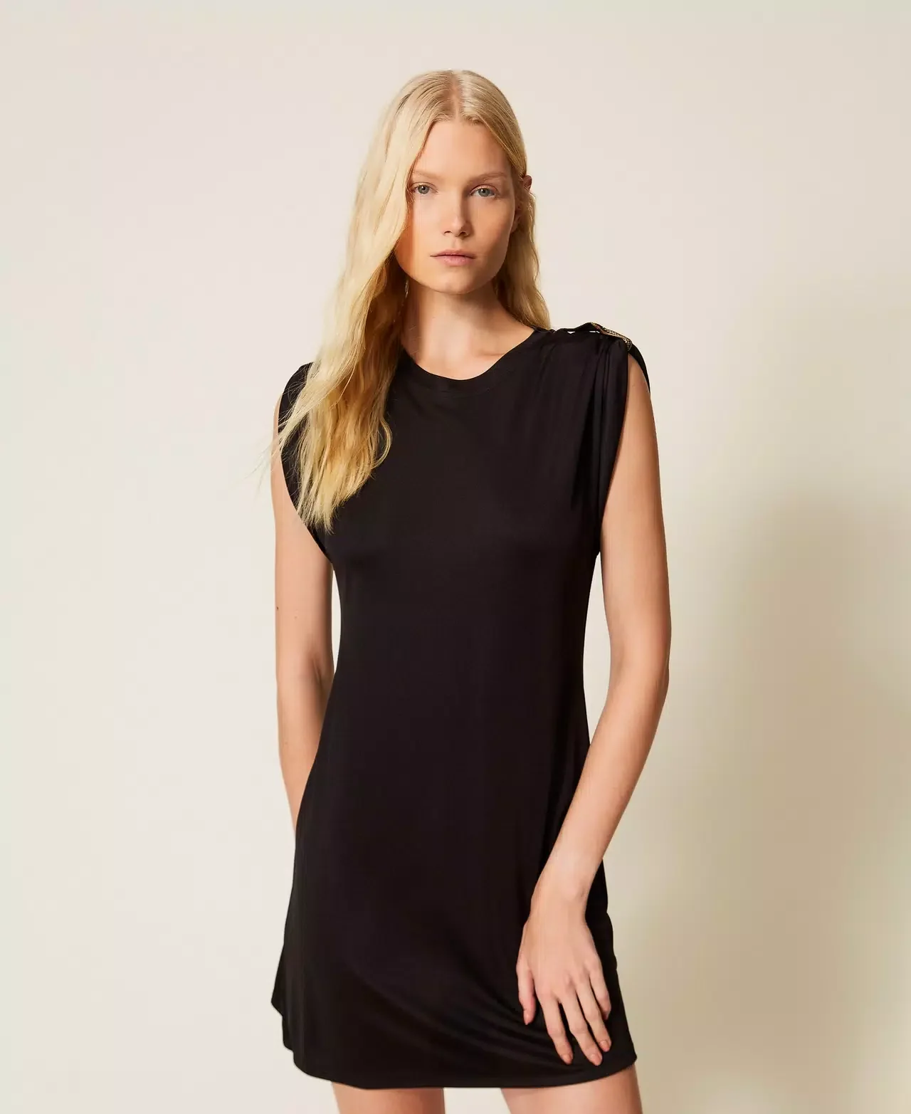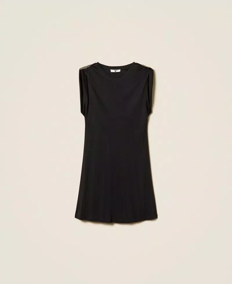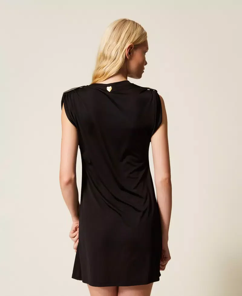 Abito corto in jersey lucido di viscosa con ricamo di paillettes e filo sulle spalle. Ha collo tondo ampio, maniche corte fissate sulle spalle con alamaro, logo a cuore in metallo dorato sul retro, linea morbida