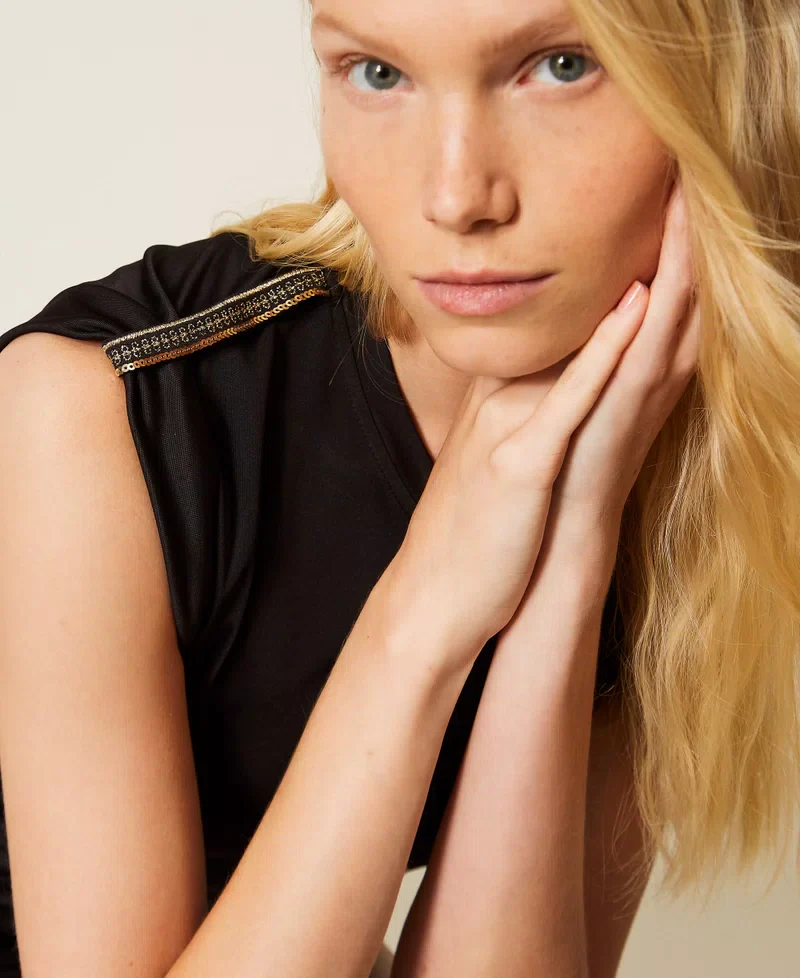Abito corto in jersey lucido di viscosa con ricamo di paillettes e filo sulle spalle. Ha collo tondo ampio, maniche corte fissate sulle spalle con alamaro, logo a cuore in metallo dorato sul retro, linea morbida Vestibilità slim – VA PRESA PERLOMENO UNA TAGLIA IN PIU’ 100% viscosa. Materiale 2: 100% poliestere metallizzato