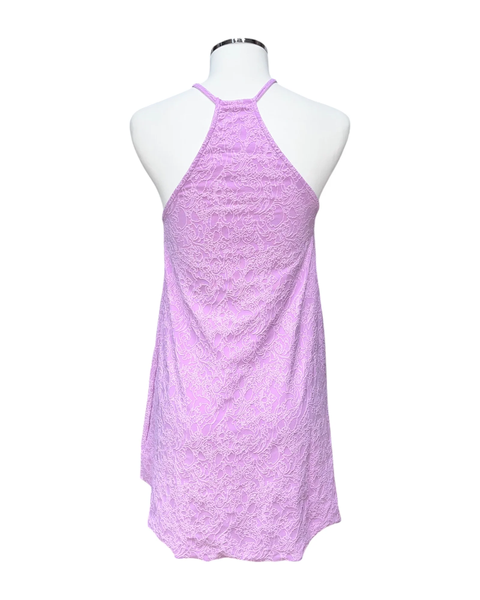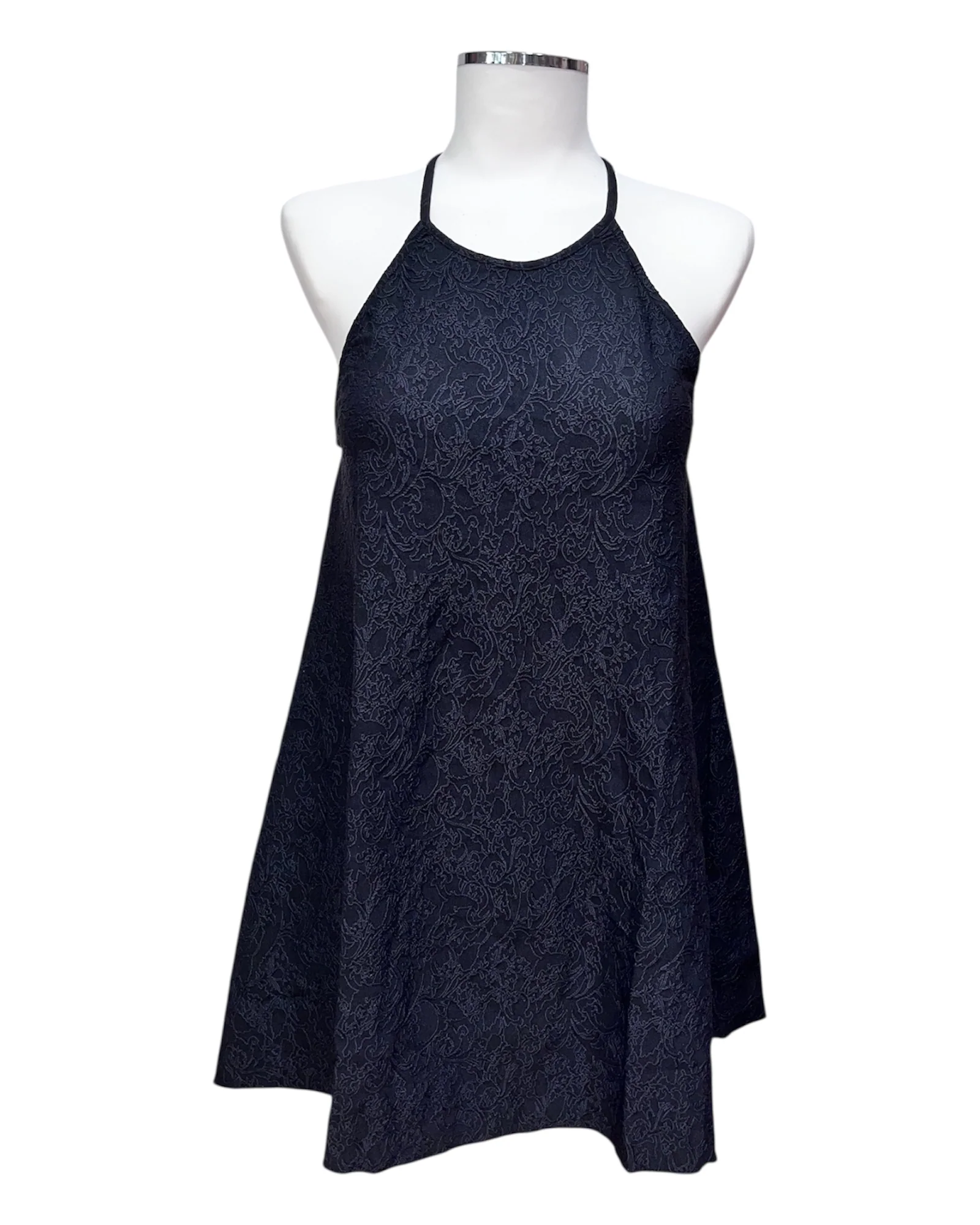 Abito corto tinta unita con bretelle sottili e scollo all’americana in lycra. Il tessuto è goffrato con un ramage tono su tono
