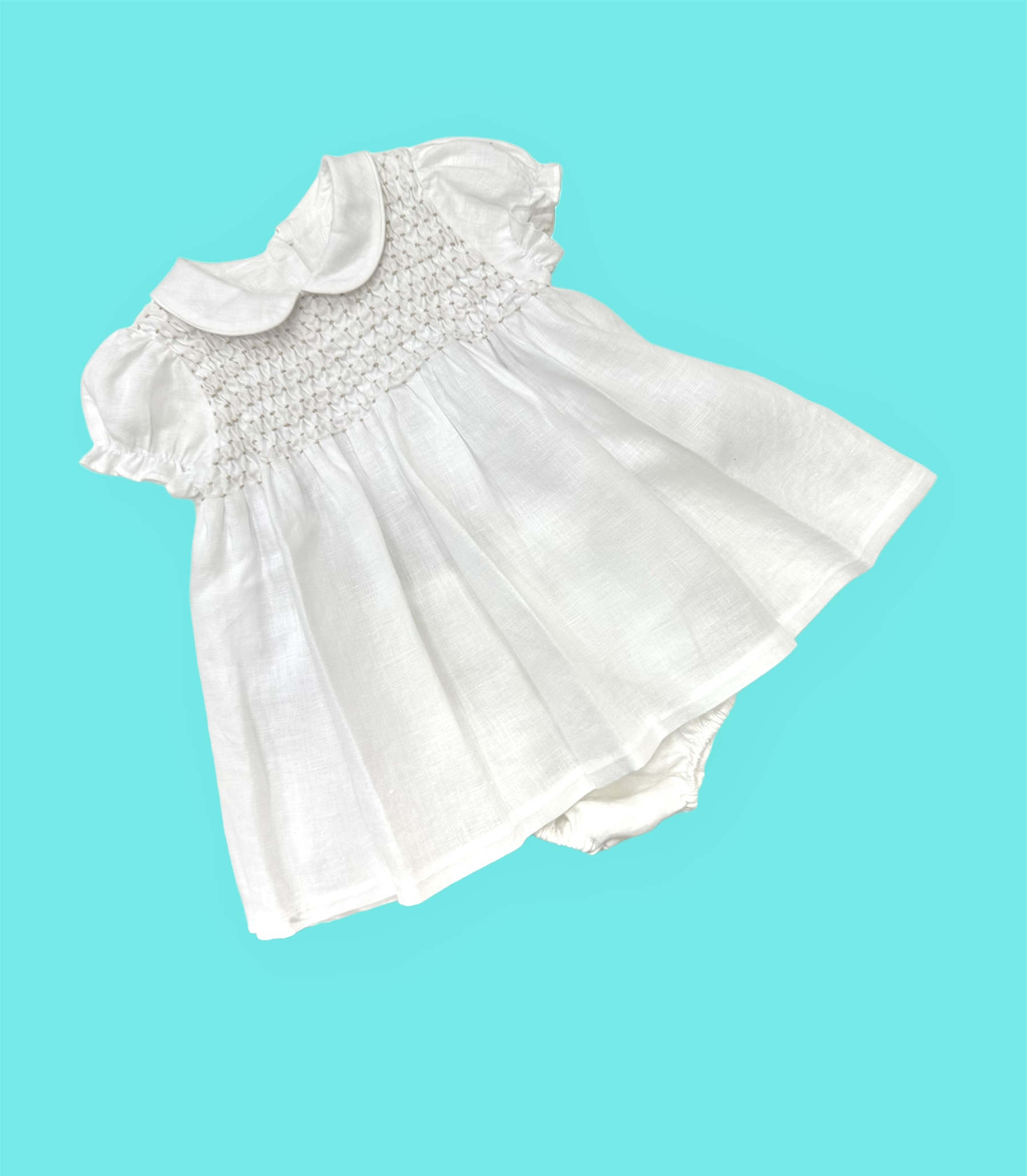 Abito con copri panno in 100% lino con lavorazione nido d’ape sabbia.
