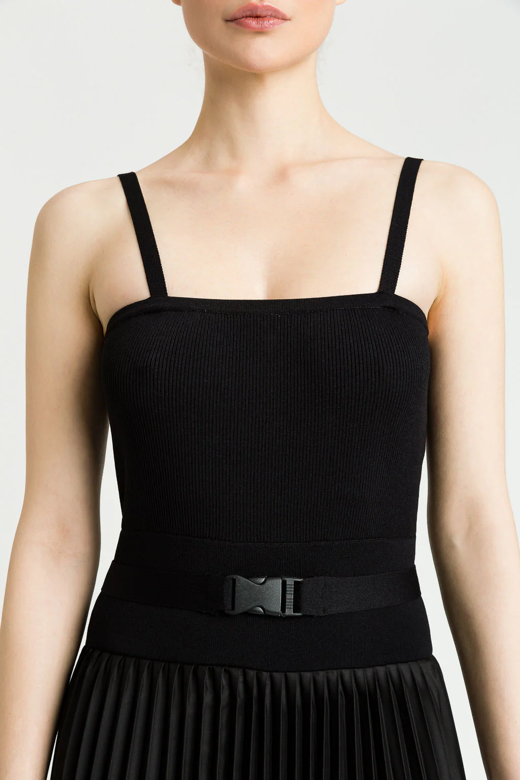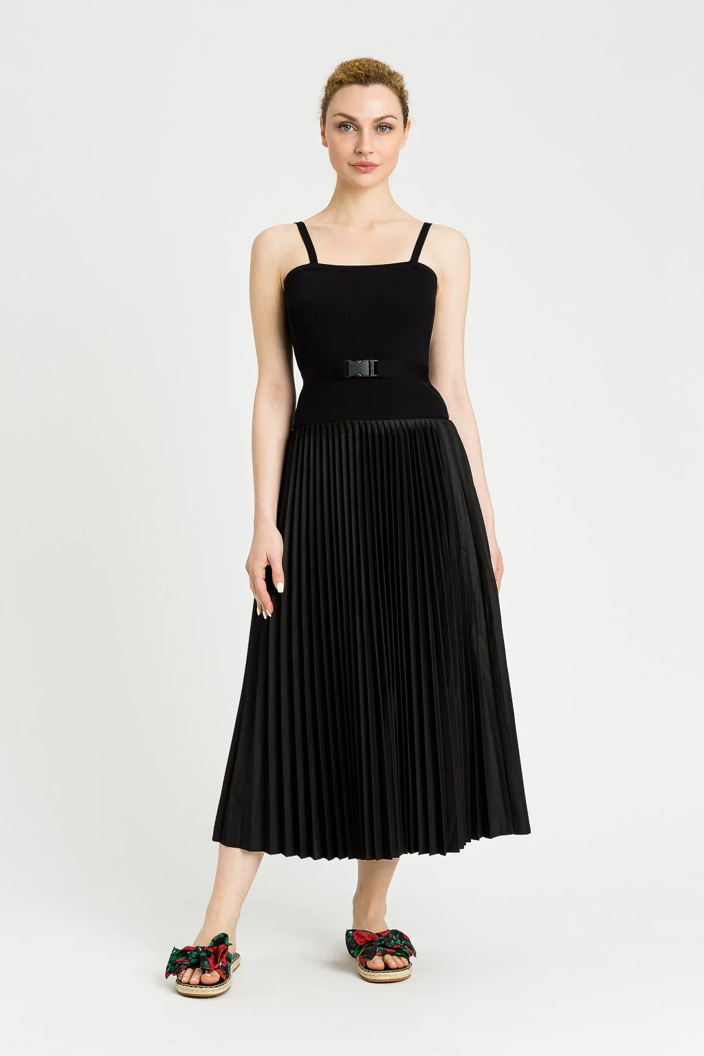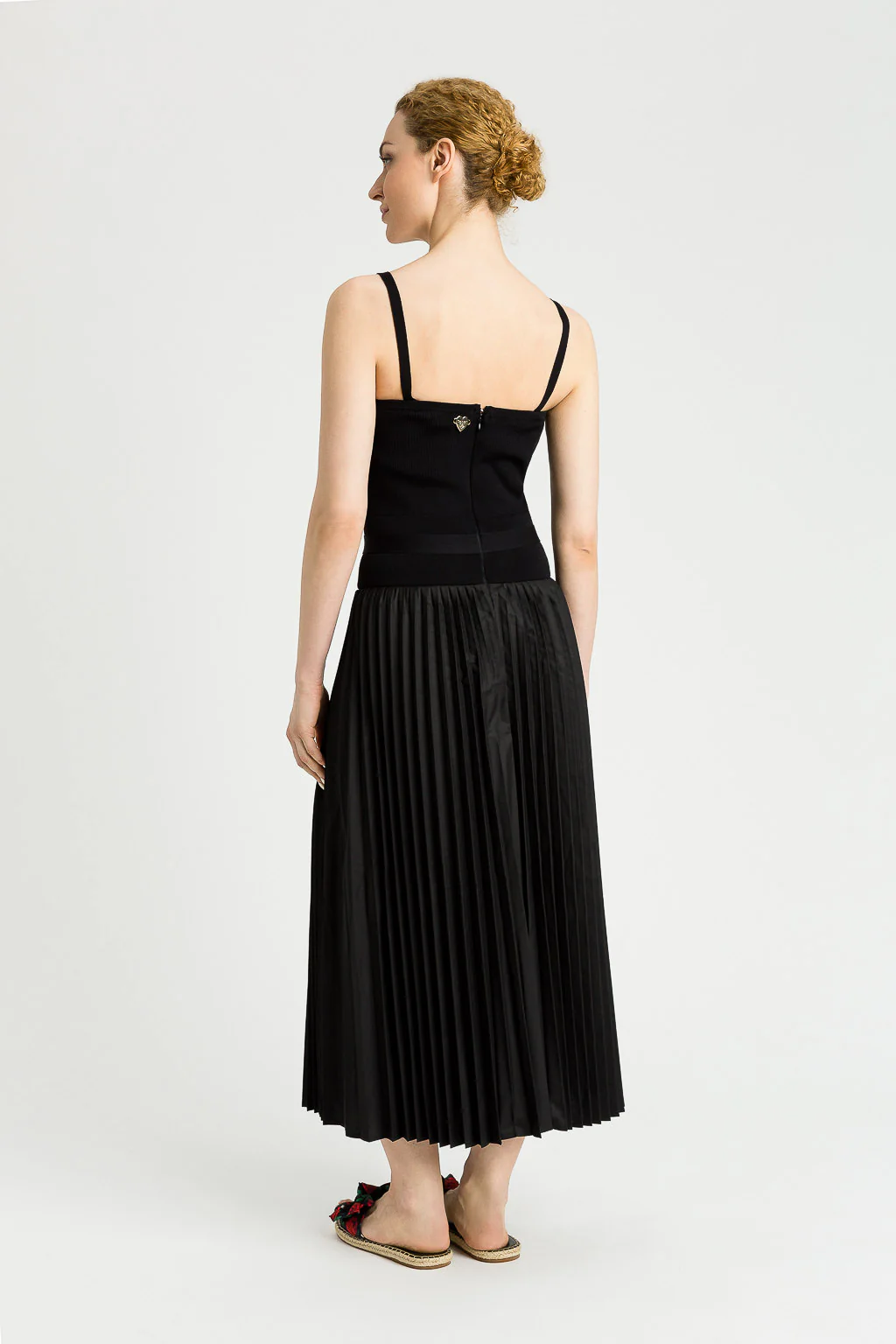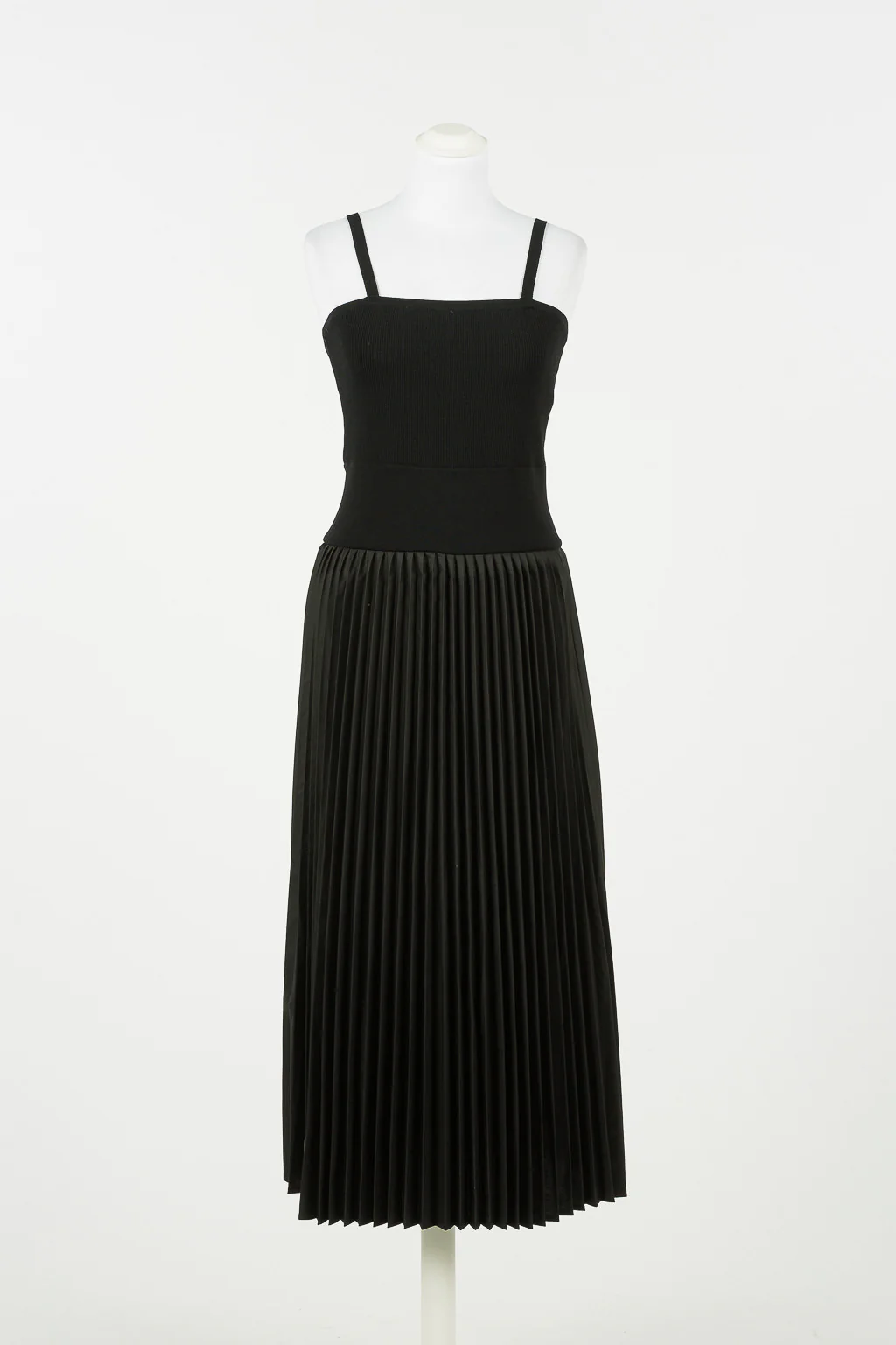 Abito lungo con bustino lavorato a maglia elasticizzata, bretelle sottili, cintura in vita e gonna plissè. L’abito si chiude con una zip sul retro del bustino.
