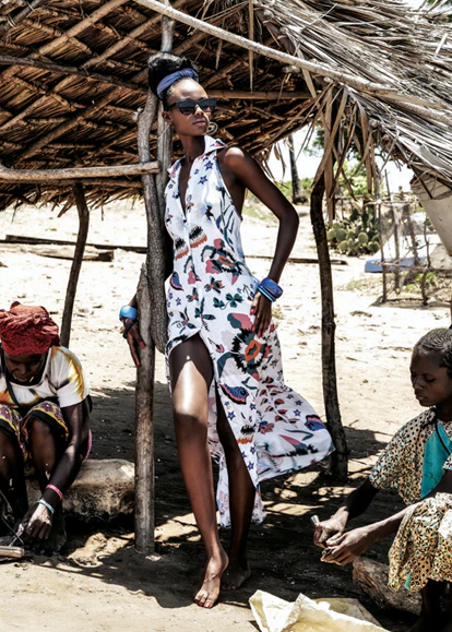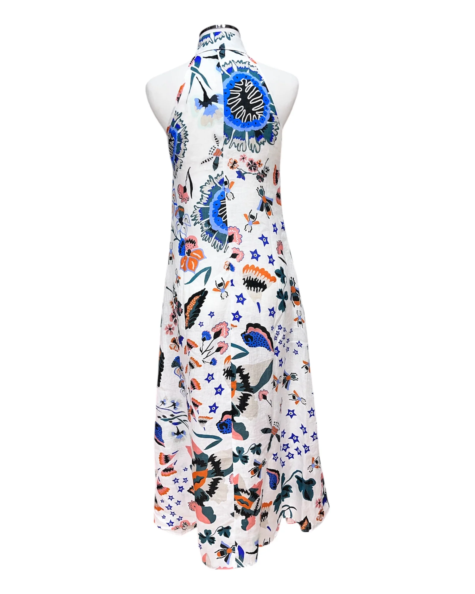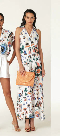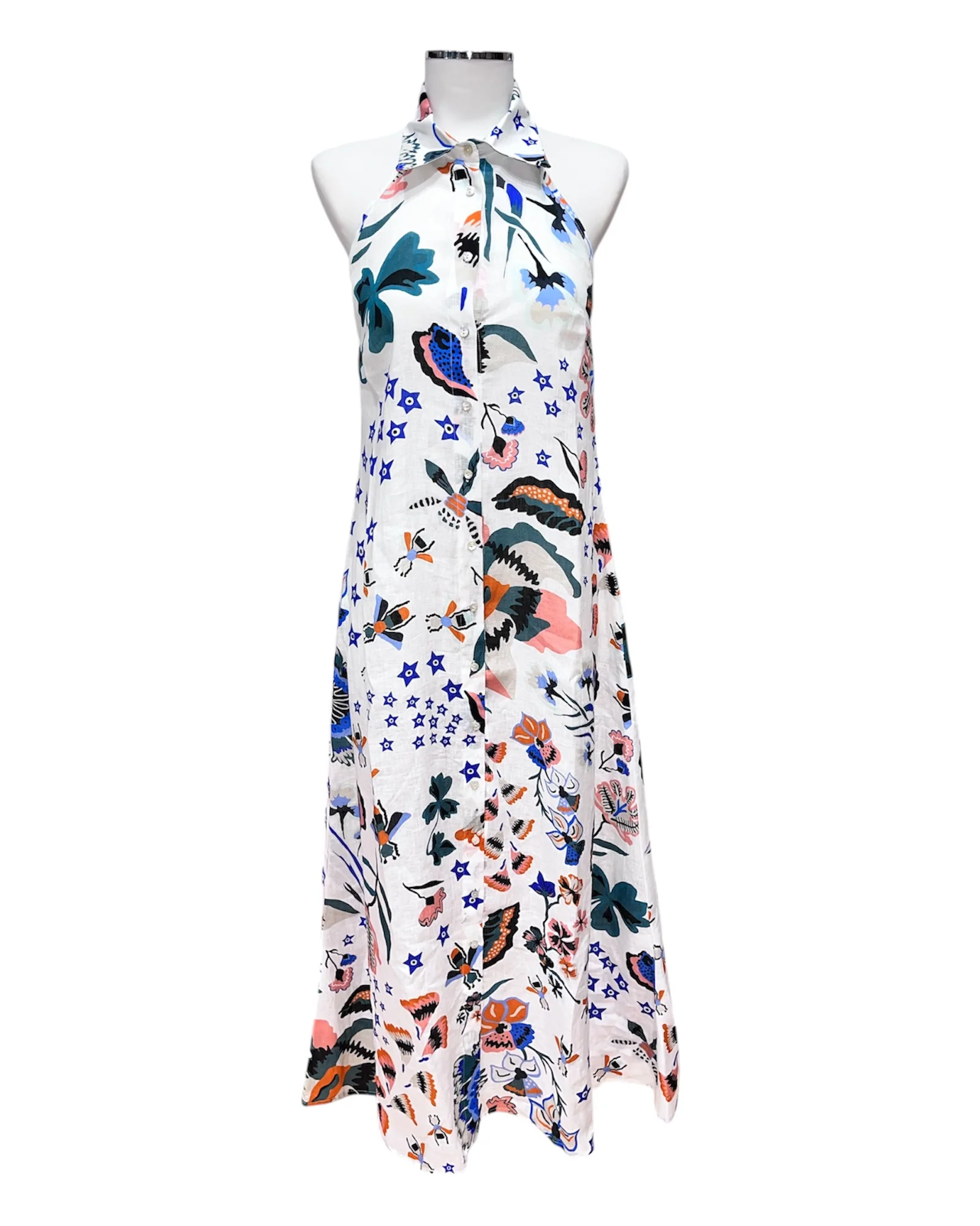 Chemisier lungo fantasia in puro lino. Ha il colletto, lo scollo all’americana e una linea sagomata sul busto e svasata sul fondo