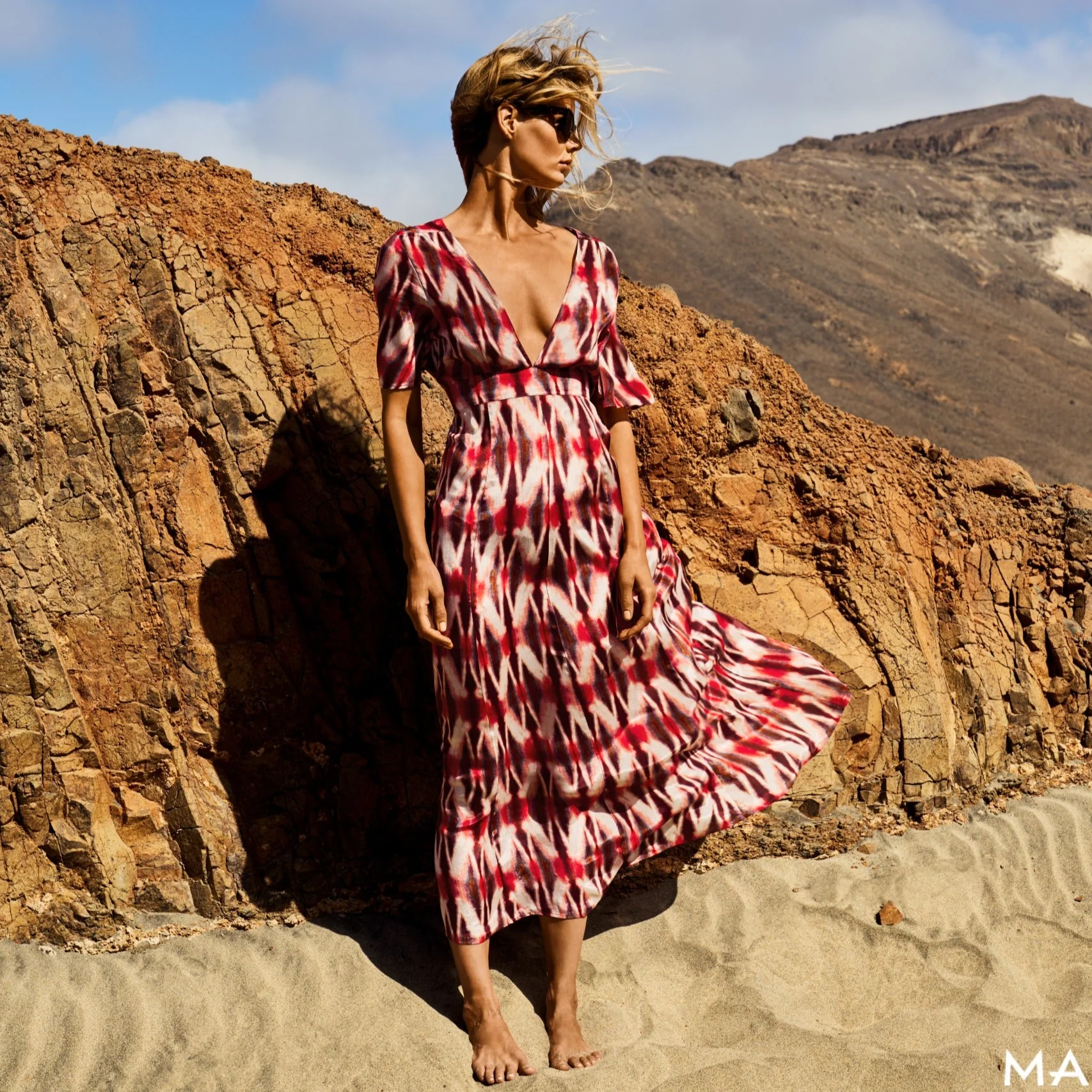 Esalta la tua femminilità con l’elegante abito lungo fantasia. Il suo scollo a V e la scollatura profonda sul retro esaltano la tua figura. Grazie alla mezza manica, potrai goderti il leggero e fresco tessuto senza rinunciare a coprirti. Semplicemente perfetto per ogni occasione!