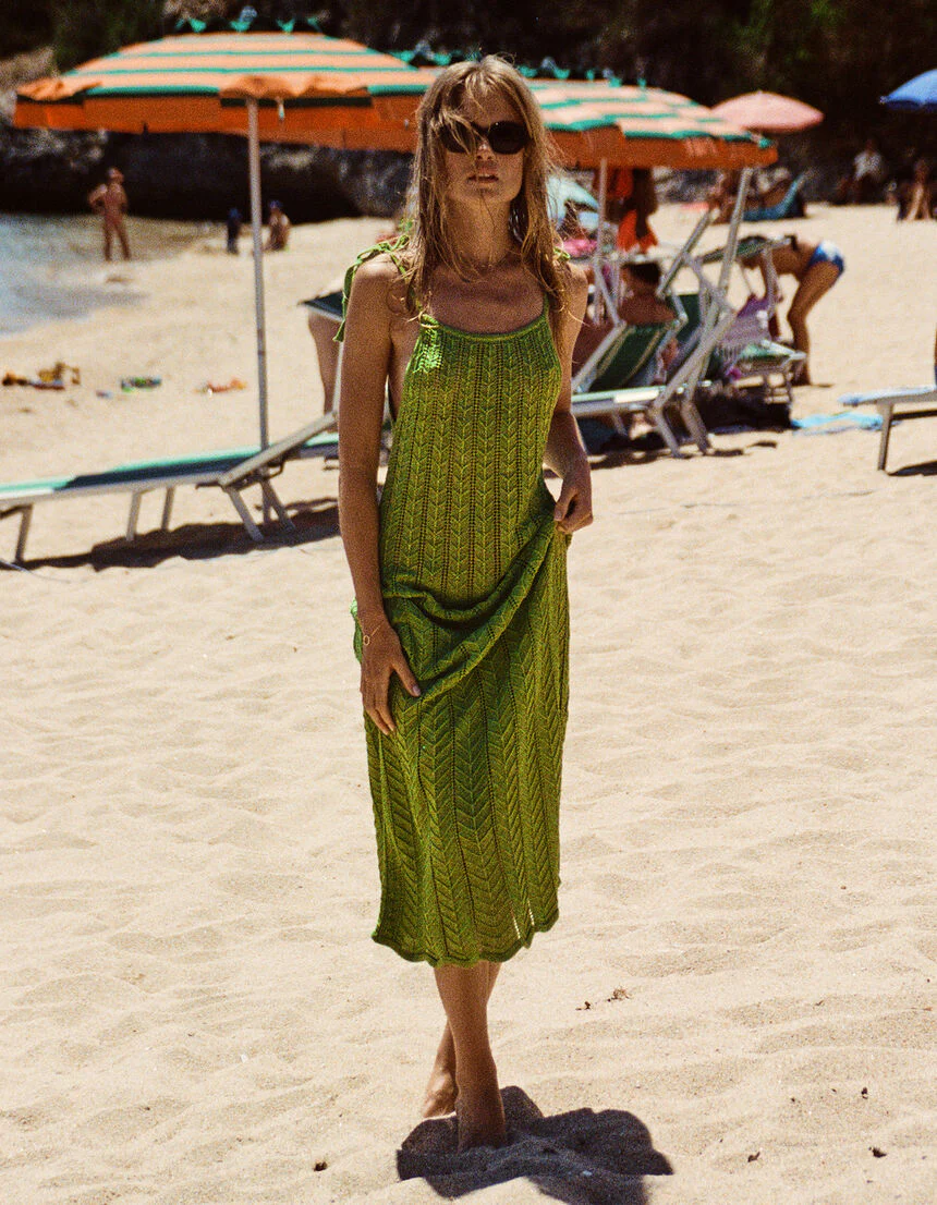 Abito lungo in filo traforato effetto spina di pesce. Ha le bretelle sottili regolabili che si chiudono sulle spalle con un fiocco, una linea sagomata che diventa più morbida sul fondo e una finitura a smerlo Tessuto: 53% Poliestere di origine biologica 29% Cotone 18% Poliestere