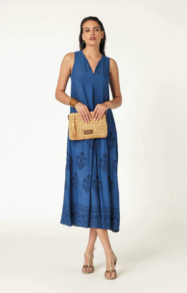 Abito lungo ricamato in leggerissimo tessuto di viscosa. E’ smanicato, girocollo con un’apertura a goccia e un piegone centrale che da ampiezza all’abito. Vestibilità comoda Tessuto: 100% Viscosa Prodotto fatto con cura in Italia