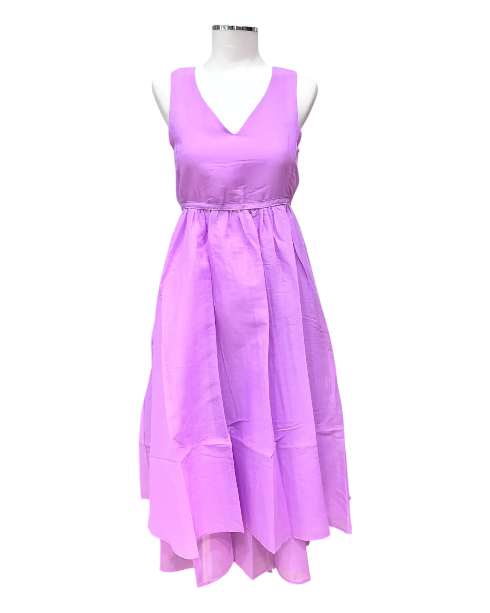 Un abito versatile, perfetto da indossare nelle calde giornate estive da mattina a sera, qualunque sia l’occasione! Smanicato con pettorina a canotta scollata a V e corpetto svasato in doppio strato di tessuto lungo fino al polpaccio, è realizzato in leggera mussola di puro cotone e dotato di fascetta in coordinato per enfatizzare il punto vita.