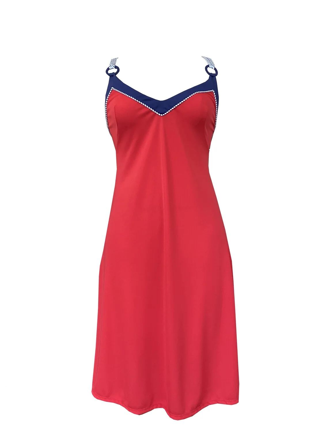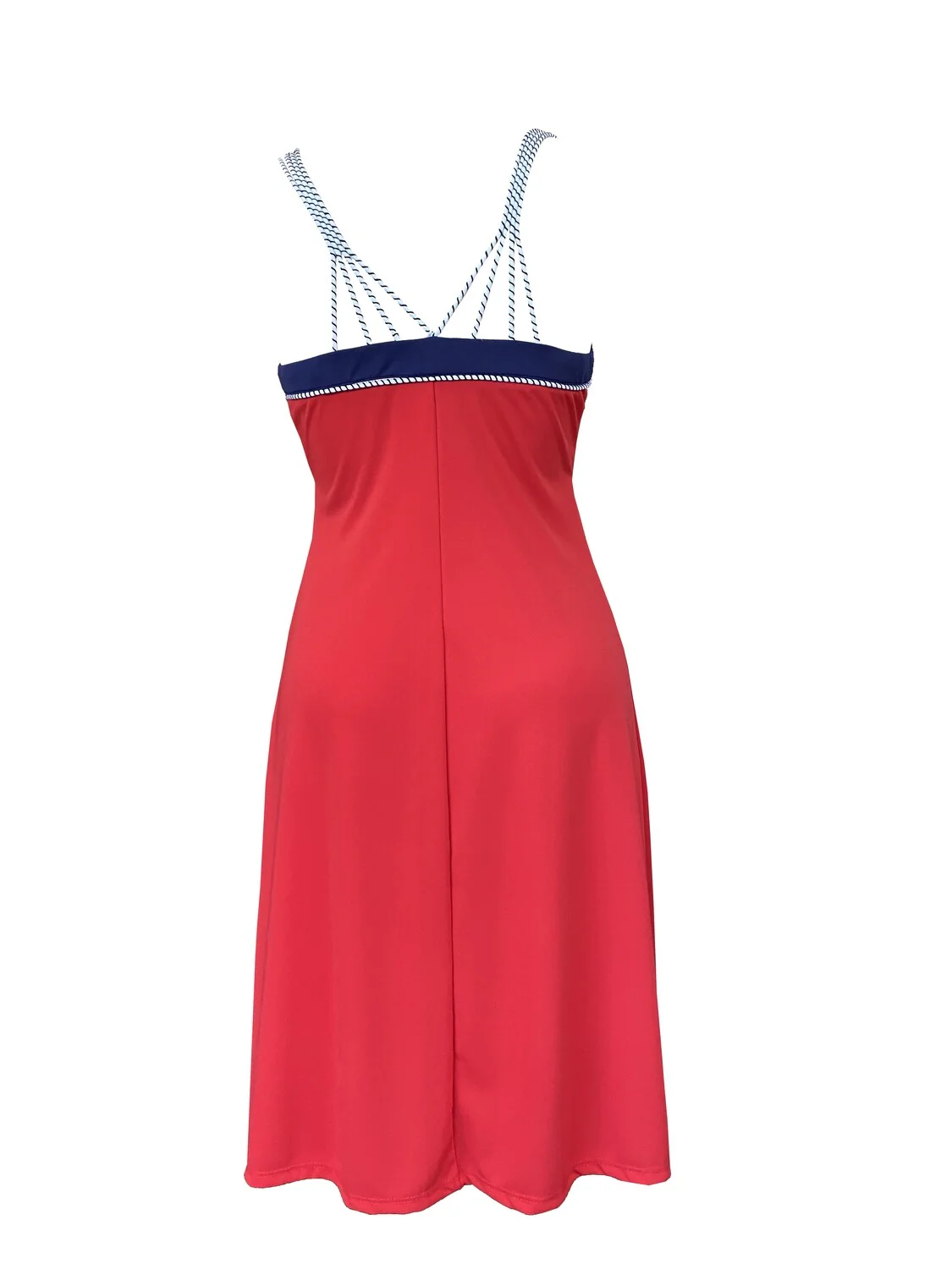 Abito midi con bretelle a cordoncino stile marinara che si incrociano sul retro. Anelli decorativi ai lati.