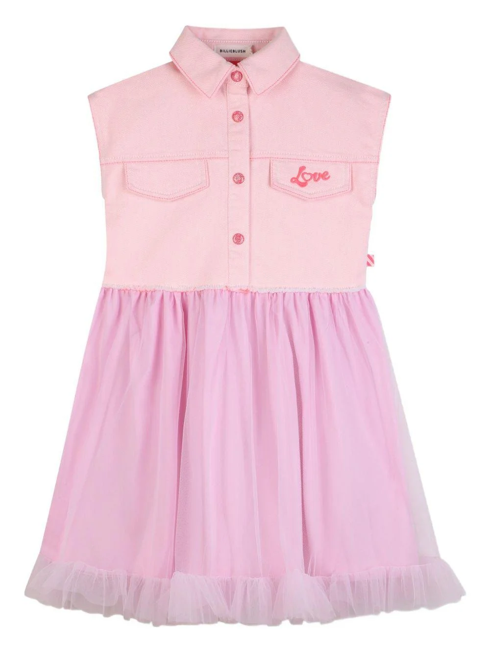 Abito smanicato Billieblush, rosa, parte superiore in denim, colletto, senza maniche, due pattine con ricamo sul davanti, chiusura con bottoni sul davanti, gonna in tulle.
