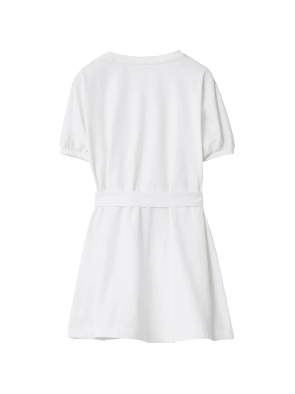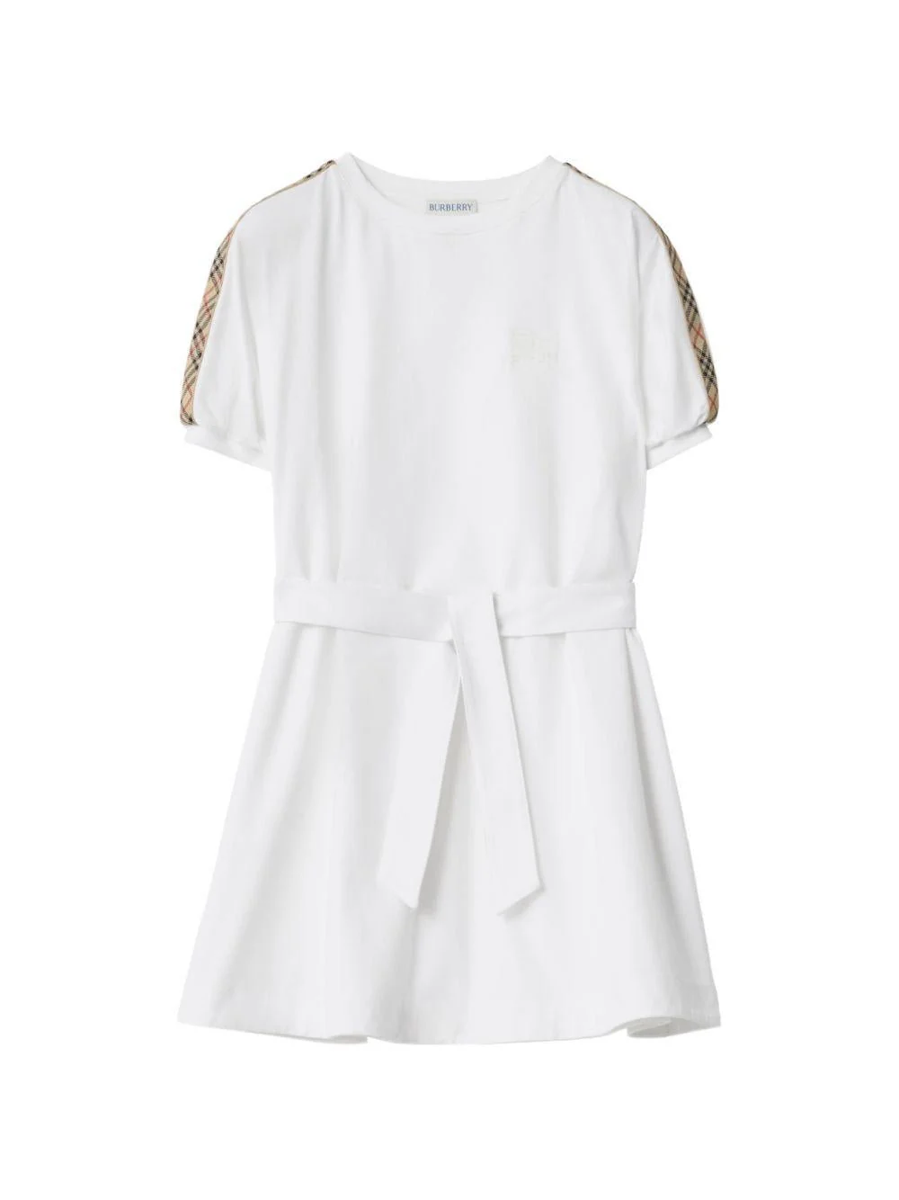 Abito con ricamo Burberry Kids, bianco, girocollo, maniche corte con banda laterale in check, logo equestre tono su tono ricamato sul petto, cintura in vita. Composizionecotone 100%
