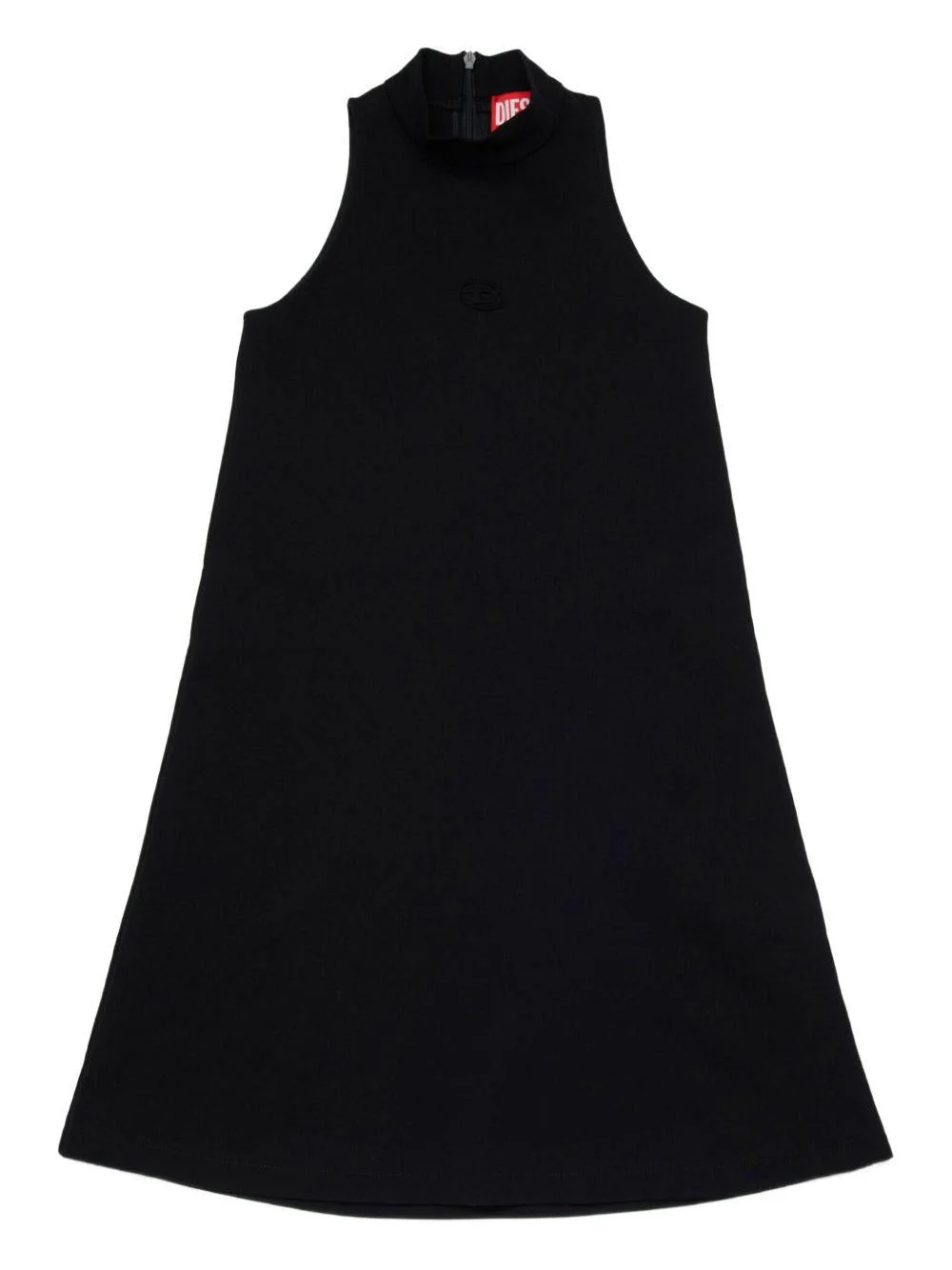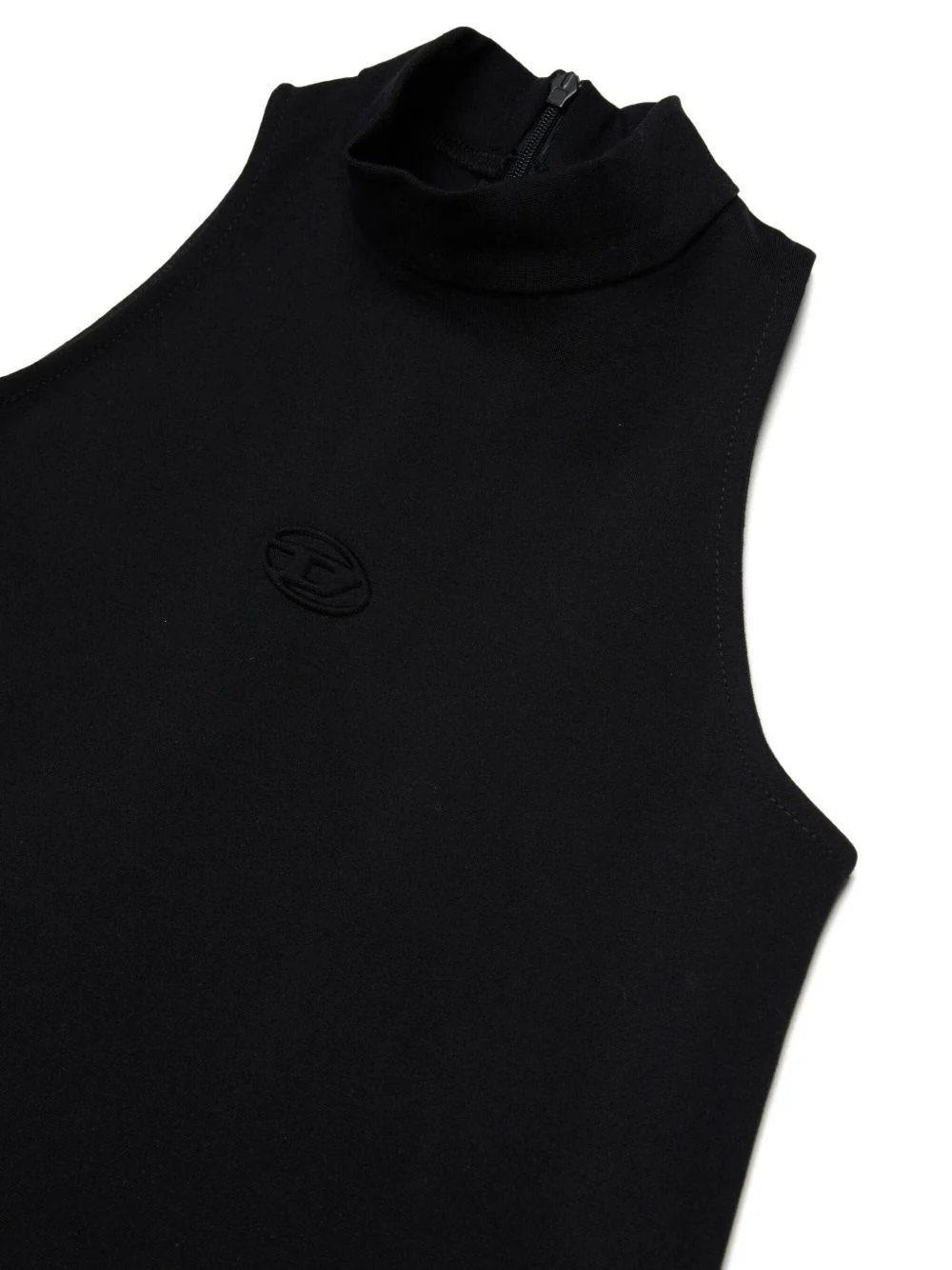 Abito Damy Diesel Kids, nero, collo semi alto, senza maniche, logo tono su tono ricamato sul davanti, chiusura con zip sul retro.