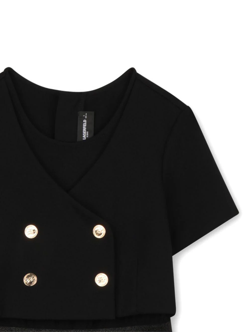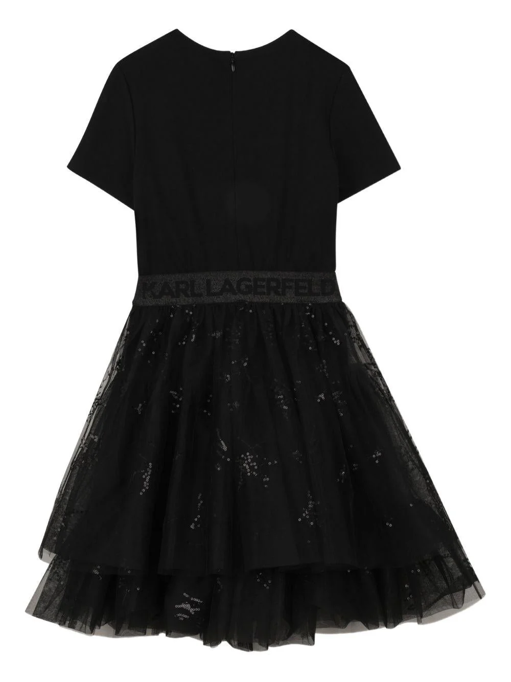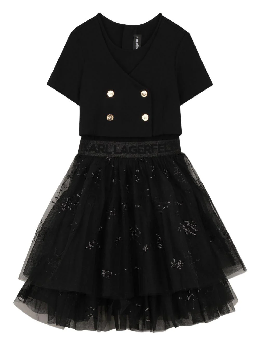 Abito con balze Karl Lagerfeld Kids, nero, parte superiore stile blazer, scollo rotondo, maniche corte, decorazioni con bottoni oro, banda logata elasticizzata in vita, gonna a strati con tulle esterno, decorazioni con paillettes.