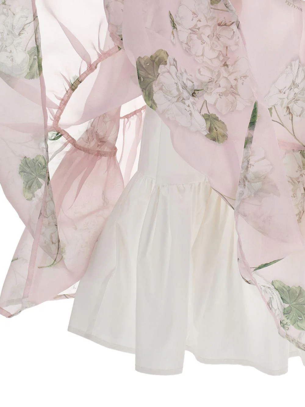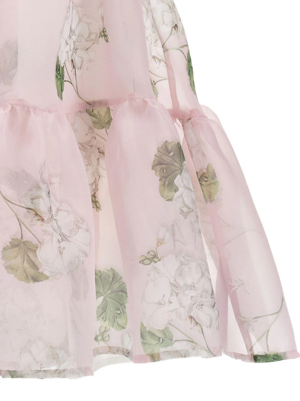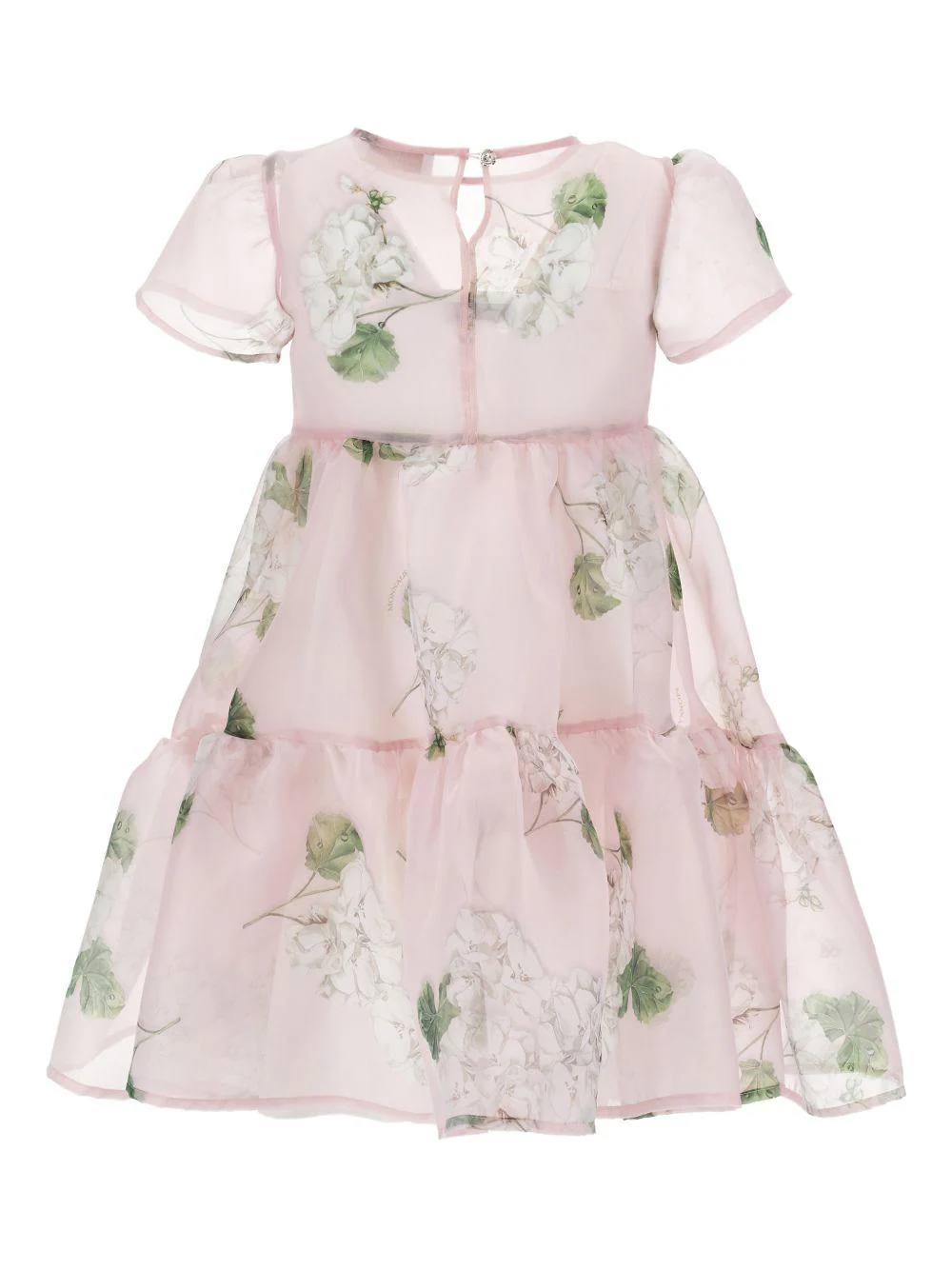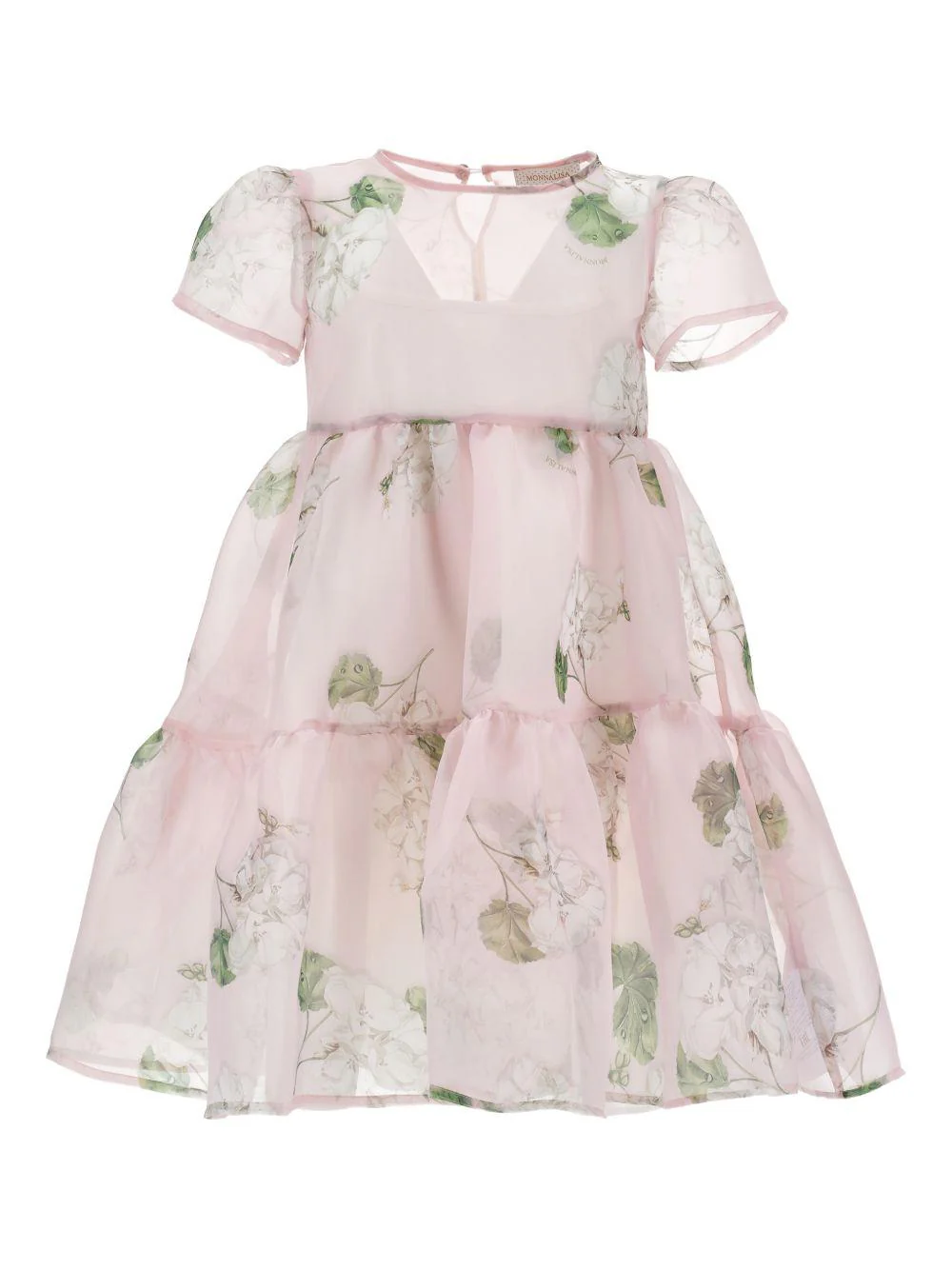 Abito a fiori Monnalisa, rosa, cerimonia, organza, girocollo, maniche corte, stampa floreale, design svasato, taglio ampio, chiusura anteriore con bottone gioiello.