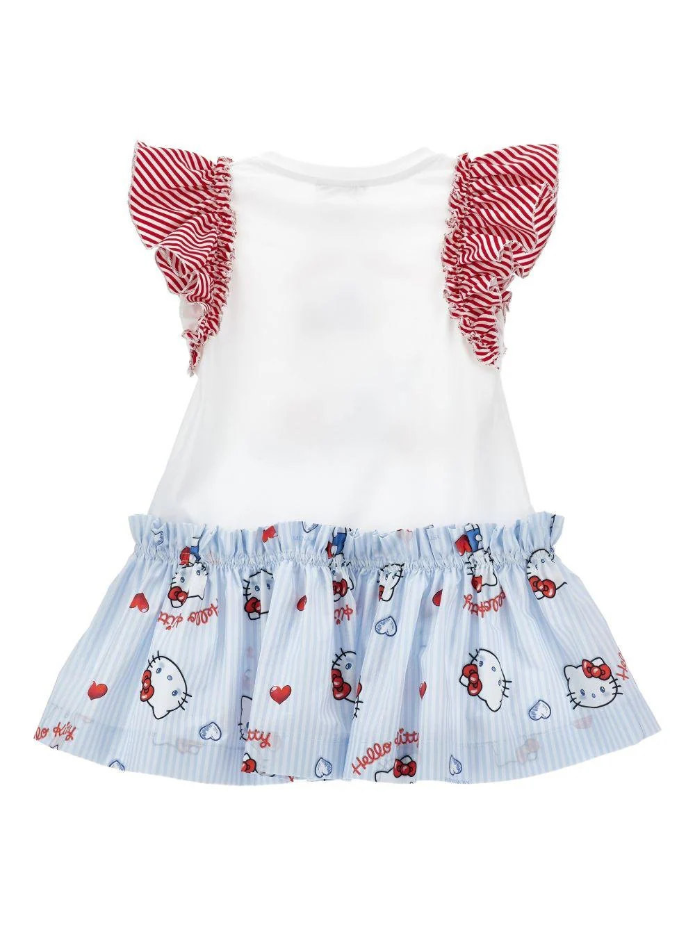 Abito Hello Kitty Monnalisa, bianco/multicolor, girocollo, rouches a righe sulle maniche, stampa Hello Kitty con strass, gonna a righe con stampa Hello Kitty. Made in Italy Composizione 100% cotone
