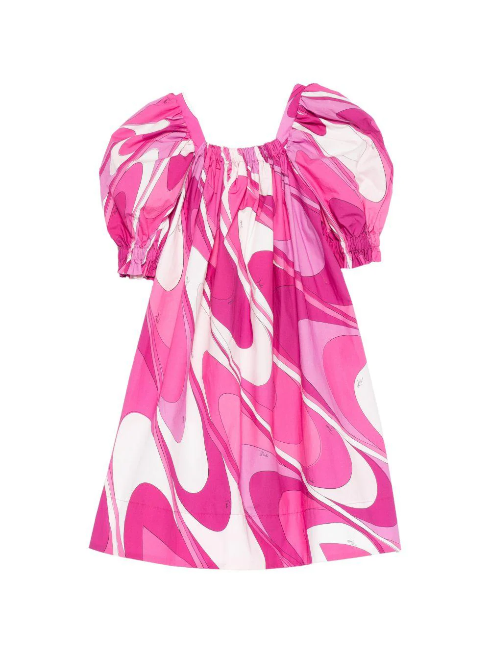 Abito con stampa Pucci Junior, viola/bianco, scollo quadrato, maniche corte a palloncino, stampa fantasia astratta, bordo increspato.Composizionecotone 65%, seta 35%