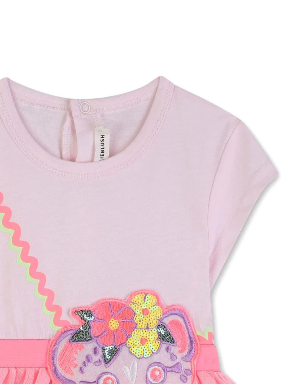 Abito con applicazione Billieblush, rosa, girocollo, maniche corte ad aletta, stampa obliqua, tigre con paillettes applicata sul davanti, gonna in tulle, chiusura con bottoni sul retro.