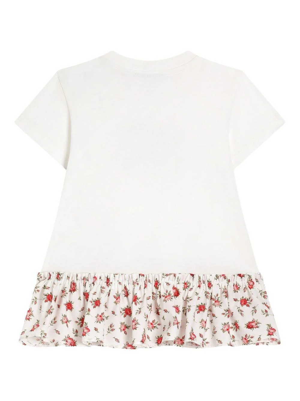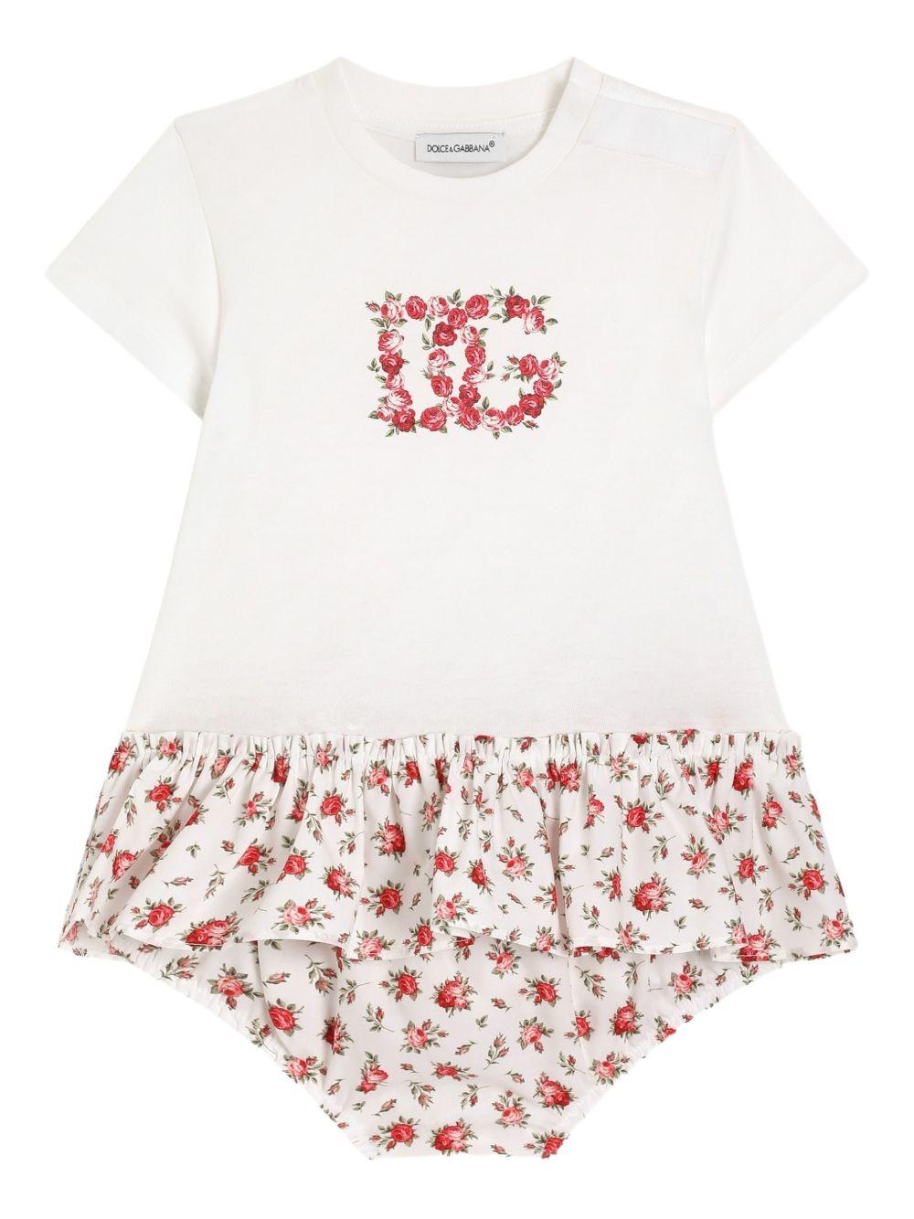 Abito a fiori Dolce & Gabbana Kids, bianco/rosso, jersey e popeline, girocollo, maniche corte, stampa logo DG con roselline sul davanti, parte inferiore con stampa roselline all-over.
