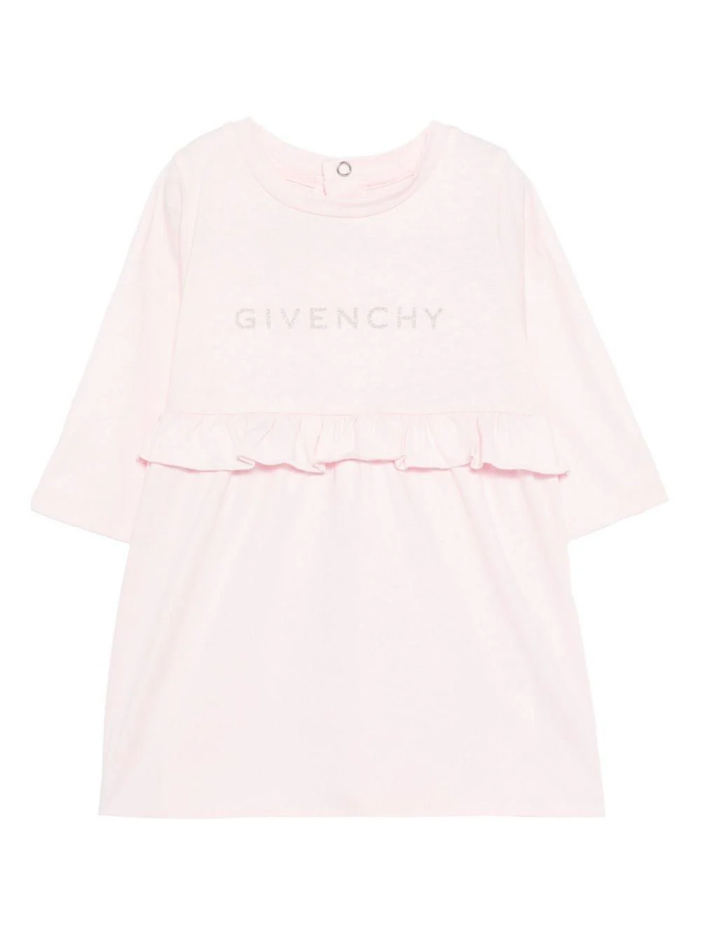 Abito con logo Givenchy Kids, rosa, girocollo, maniche lunghe, dettaglio con rouches, logo glitterato sul davanti, chiusura con bottoni sul retro.Composizionecotone 100%