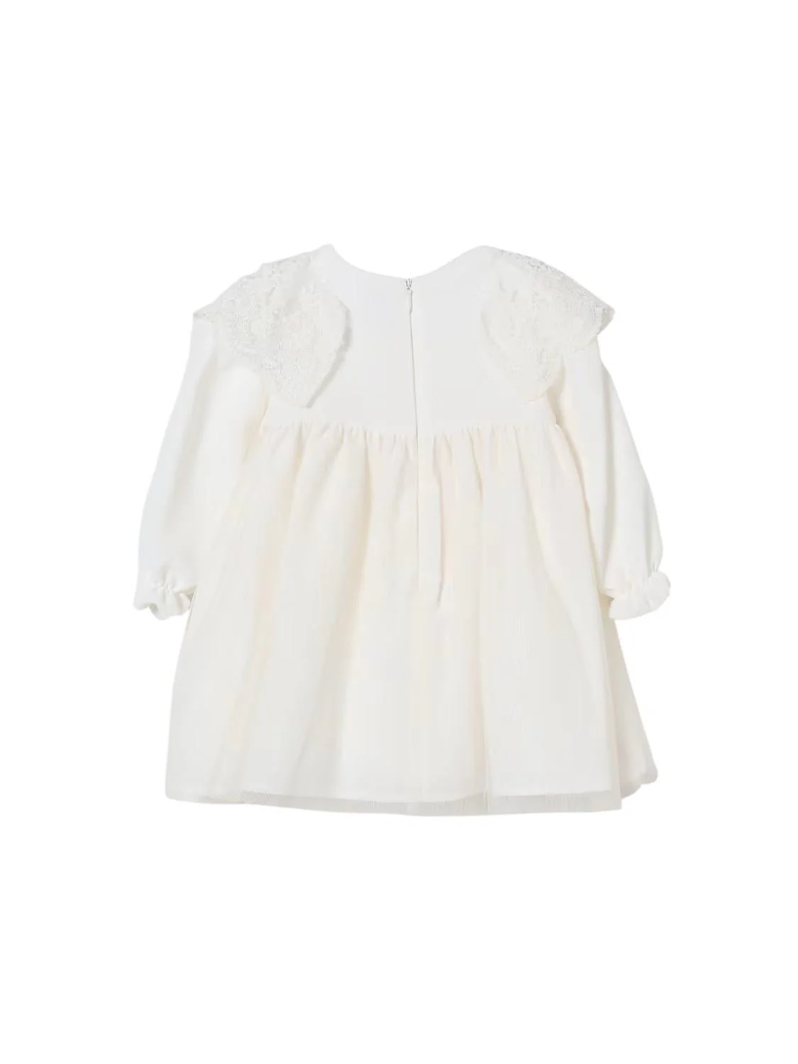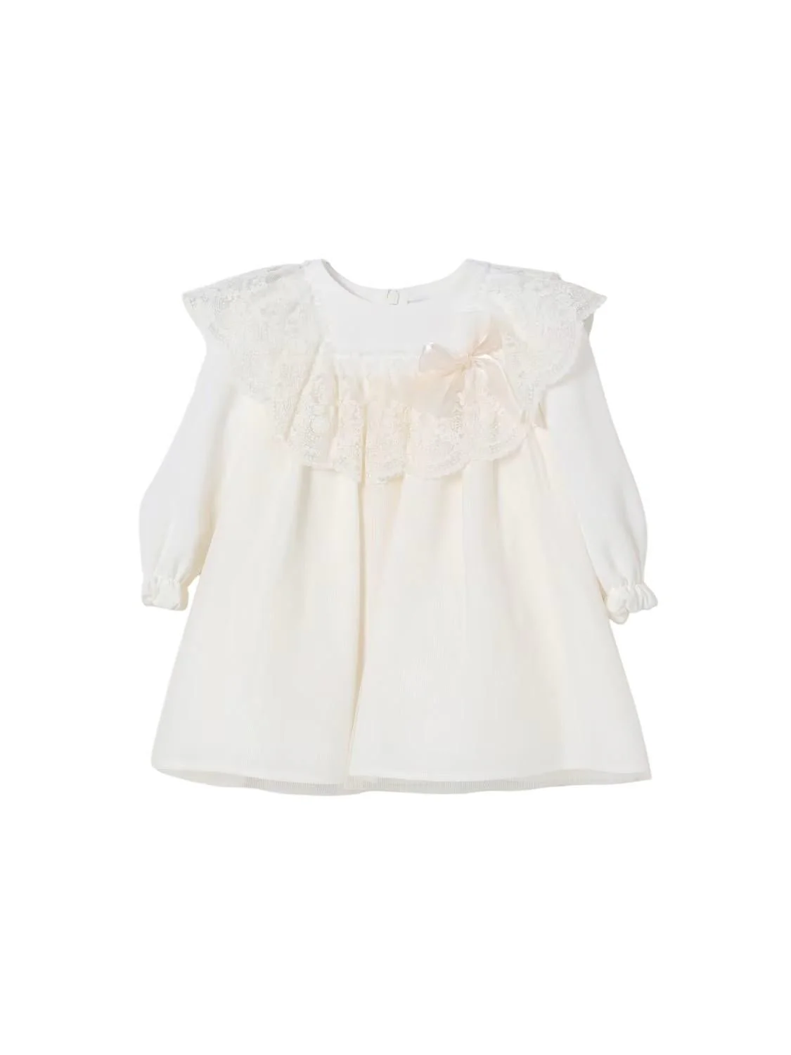 Abito Marlù Couture, vaniglia, maniche lunghe, girocollo, inserto in pizzo con fiocchetto, chiusura con zip sul retro, gonna svasata.