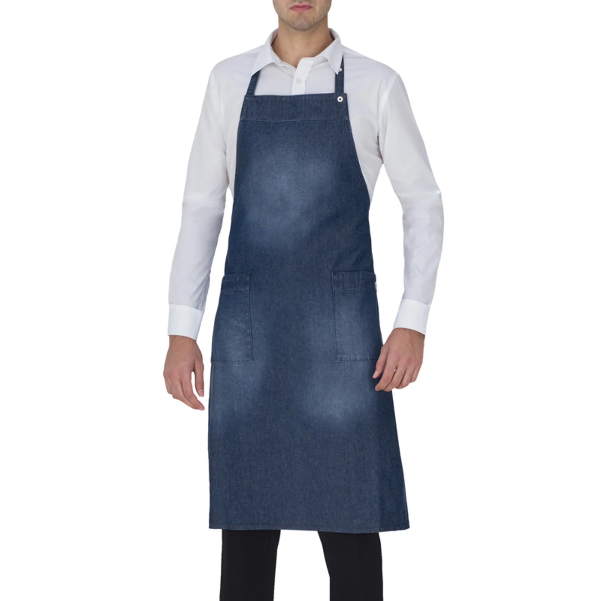 Grembiule collo regolabile 65% poliestere 35% cotone 190 gr/mtq Taglia unica 2 Tasche – Allacciatura collo regolabile con bottoni automatici Facile stiro