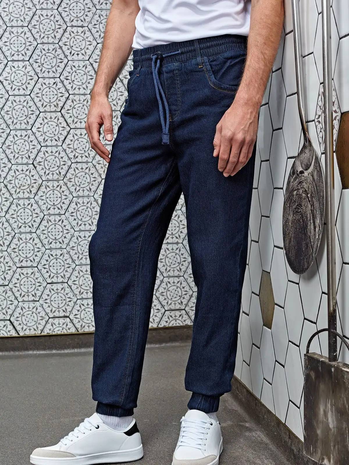 77% cotone, 22% poliestere, 1% elastane. Pantaloni da cuoco stile jogging, polsini alle caviglie, girovita elastico e regolazione con coulisse. Tasche laterali e posteriori, tessuto morbido ed elastico.