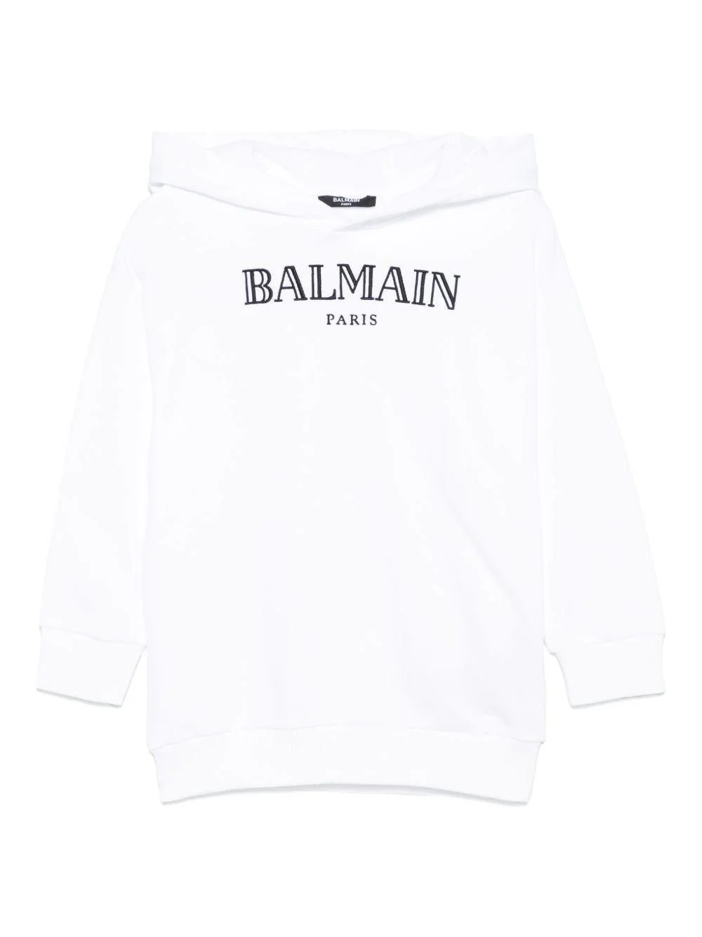 Felpa con cappuccio Balmain Kids, bianco, maniche lunghe, polsini, stampa logo sul davanti.