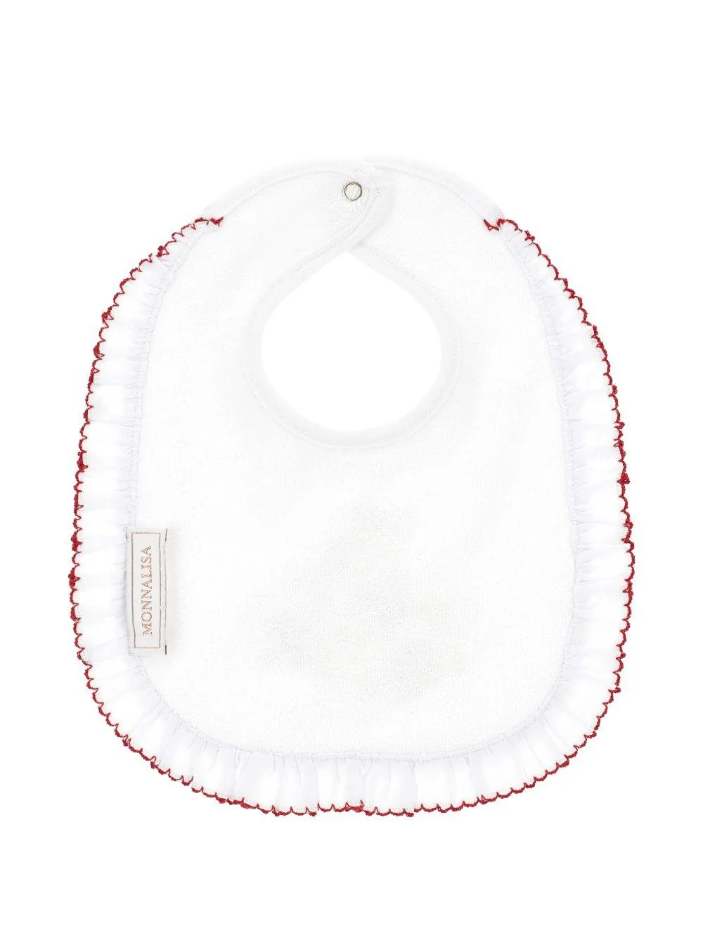 Bavaglino Winnie the Pooh Monnalisa, bianco, morbido cotone, stampa Winnie the Pooh, orlo con volant in contrasto, chiusura con bottone.