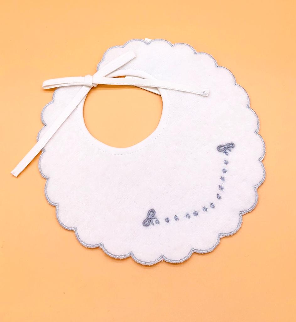 Bavetta in spugna cinigliata con ricamo realizzato a mano in grigio perla.