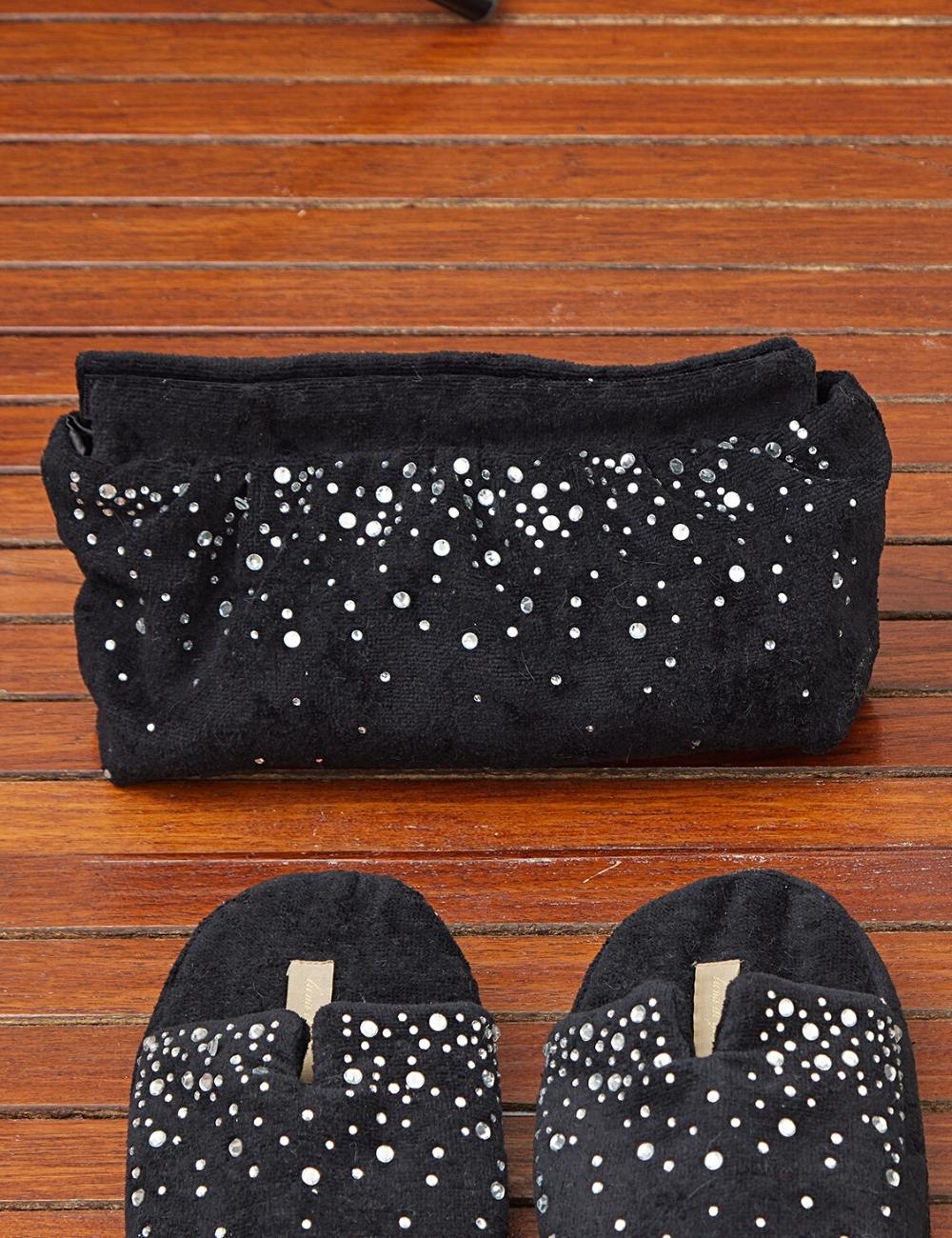Beauty-case capiente arricchito con inserti di strass. Chiusura a strappo. spugna cimata 360 gr./mq Made in Italy