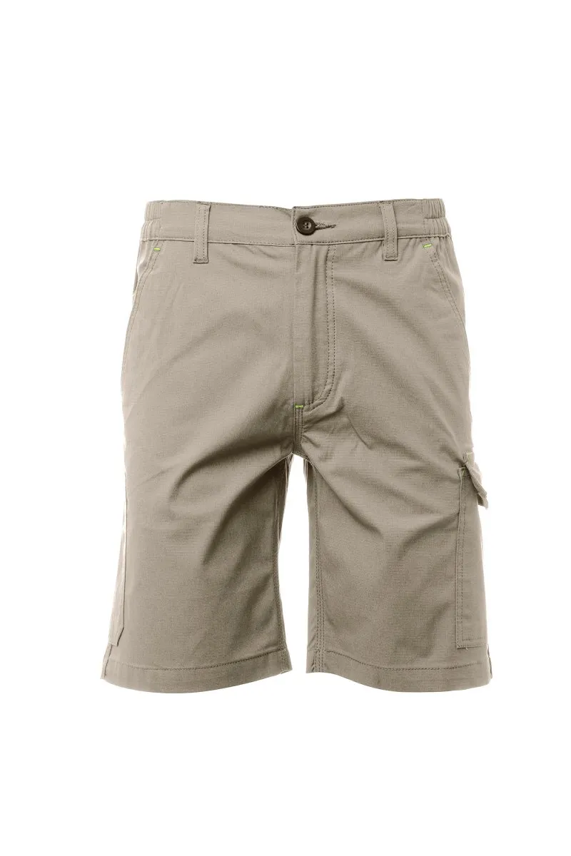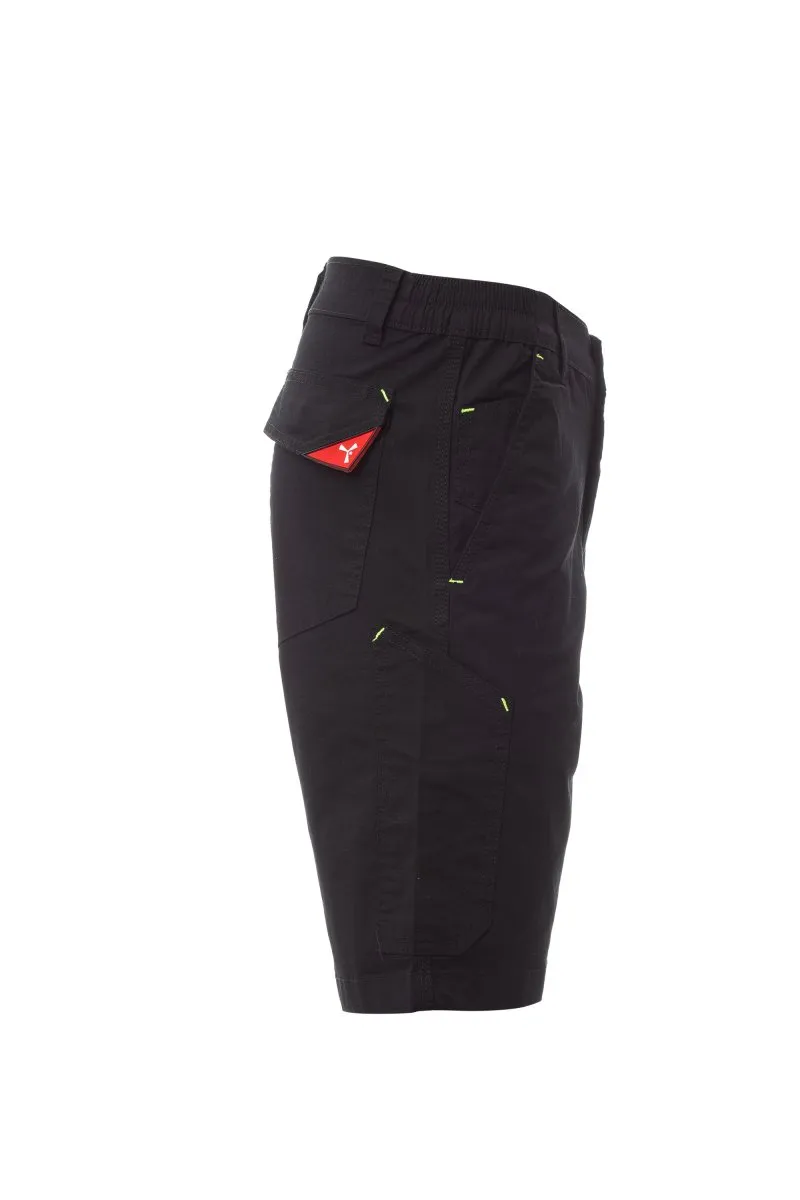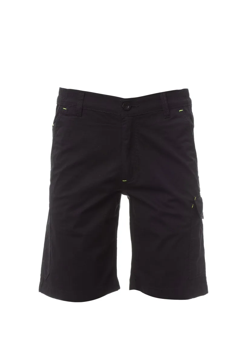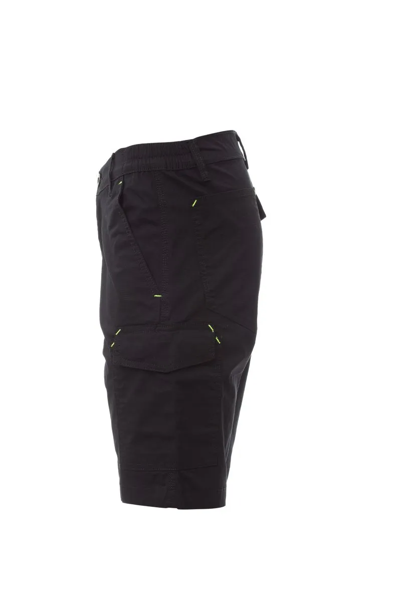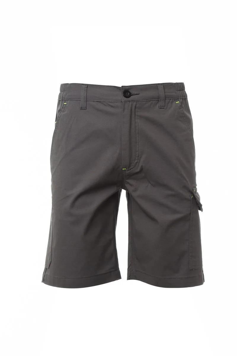 Bermuda realizzato in tessuto ripstop stretch, leggero, con passanti ed elastico in vita, chiusura patta con zip e bottone in cintura. Tasche anteriori a taglio classico, con taschino porta monete nella tasca destra a capo indossato e un porta metro laterale. Tasca laterale sinistra con patta di chiusura LOCK SYSTEM. Due tasche posteriori, di cui una con patta e velcro. Cuciture a triplo ago.