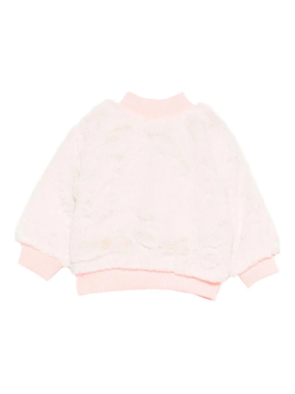 Giacca in pelliccia Billieblush, rosa, maniche lunghe, polsini, orli a coste, cuori con paillettes sul petto, chiusura con zip.
