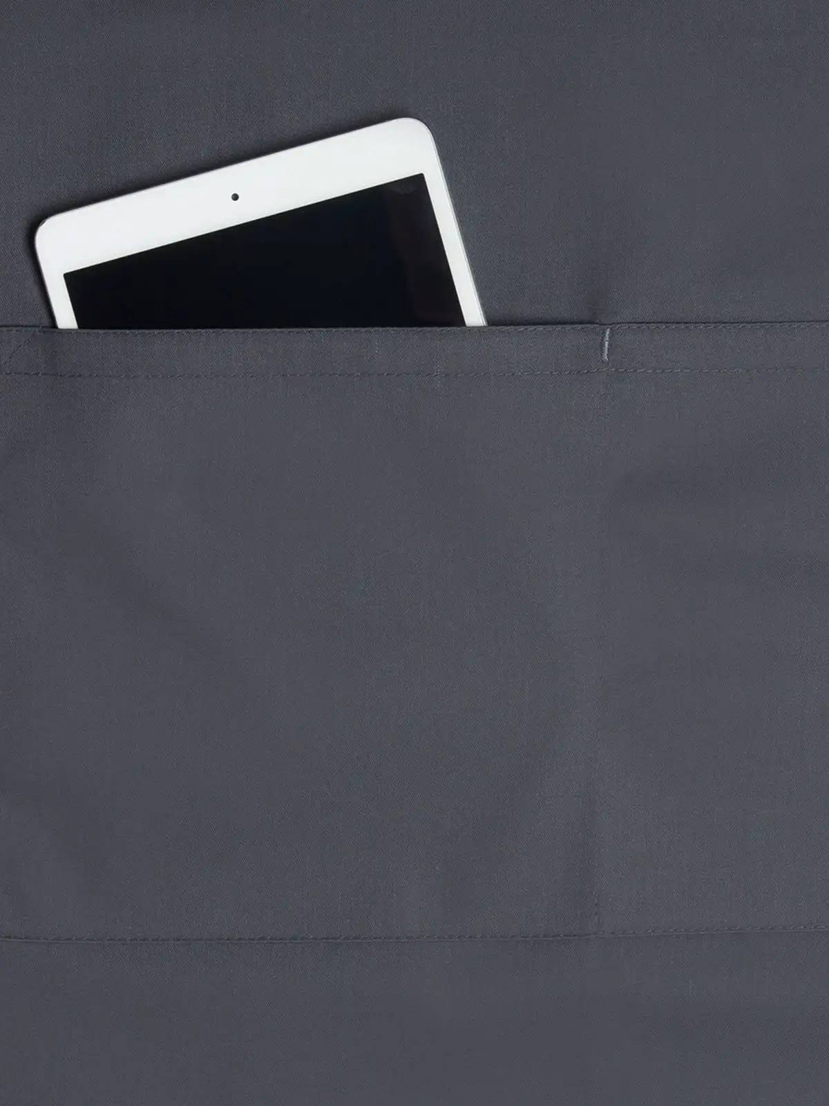 65% poliestere, 35% cotone. Grembiule con pettorina e lacci dello stesso tessuto, cucitura rinforzata, laccio della pettorina con fibbia per regolazione continua della lunghezza fino a 70 cm, tasca applicata con 2 scomparti (40 x 20 cm) Misura 75x90cm.