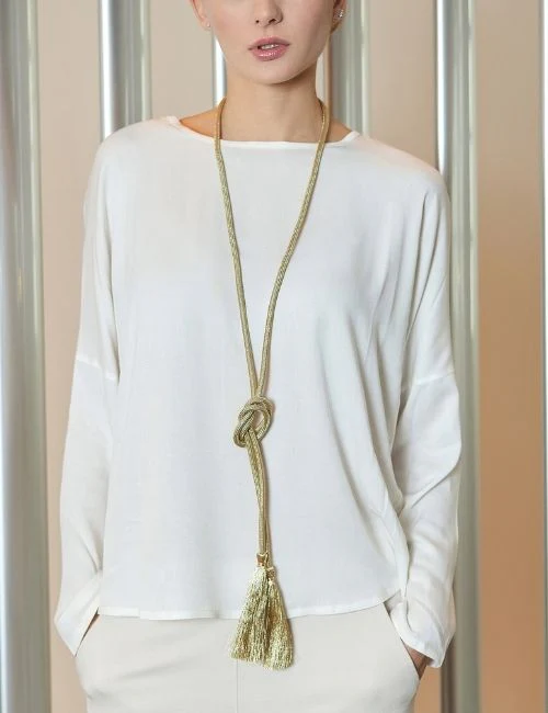 Blusa girocollo in viscosa. Una linea pulita e semplice per un look giornaliero. Tessuto 100% viscosa Colori disponibili: Panna Made in Italy