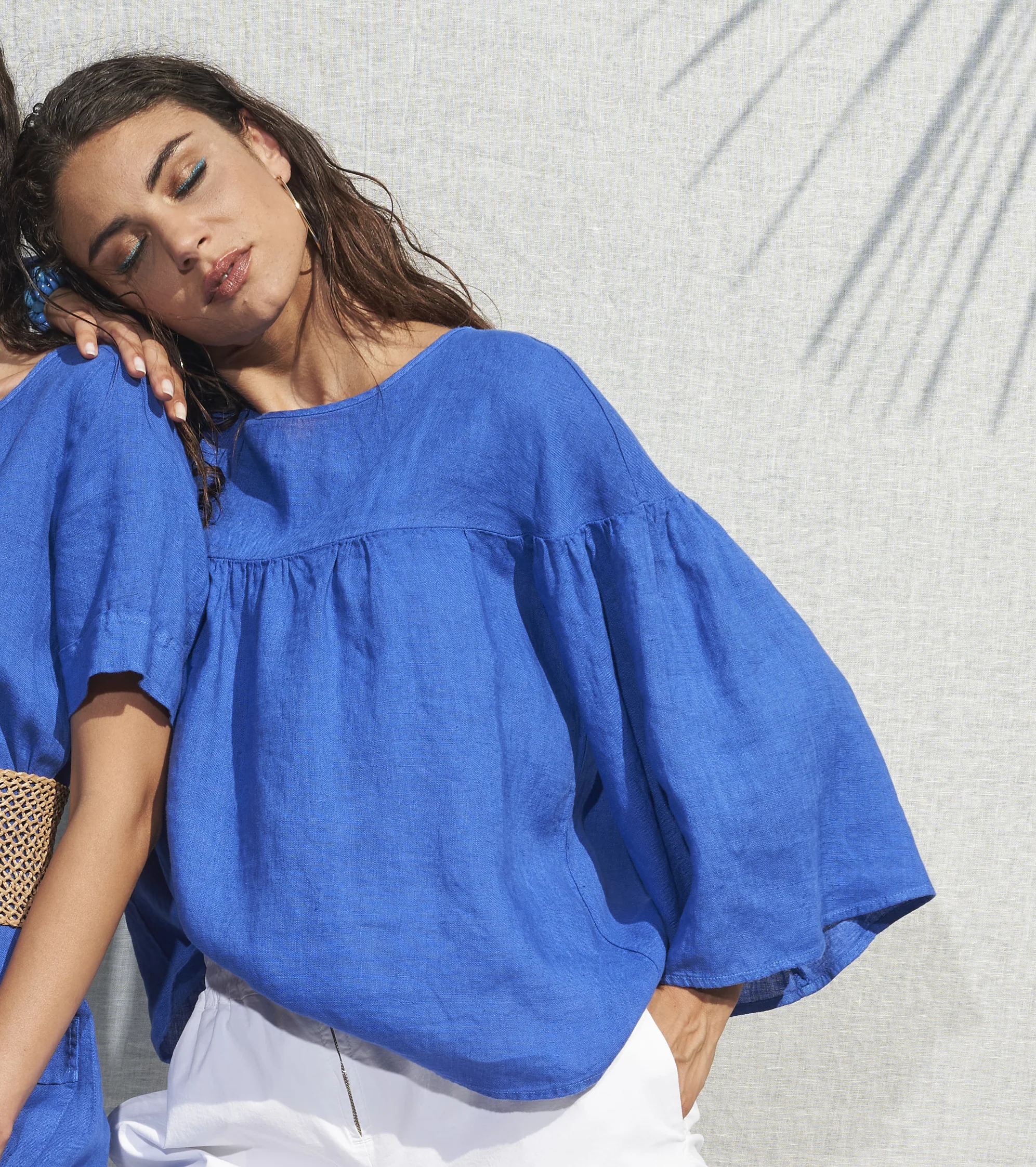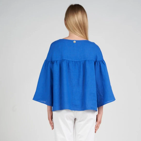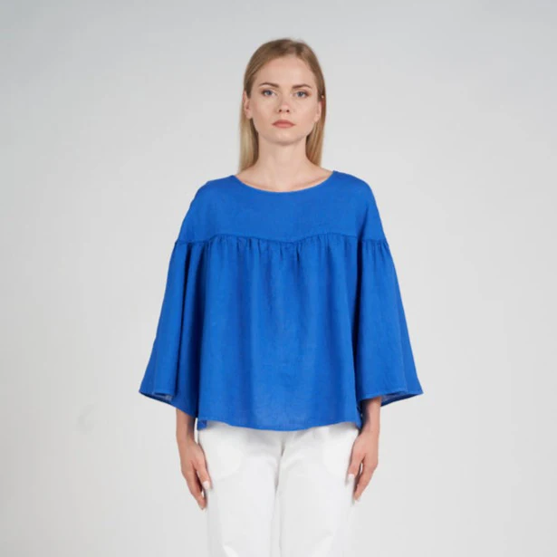 Blusa girocollo maxi volant di Fabbrica del Lino. Manica 3/4 a campana. Vestibilità Comoda. Tessuto 100% Lino Made in Italy