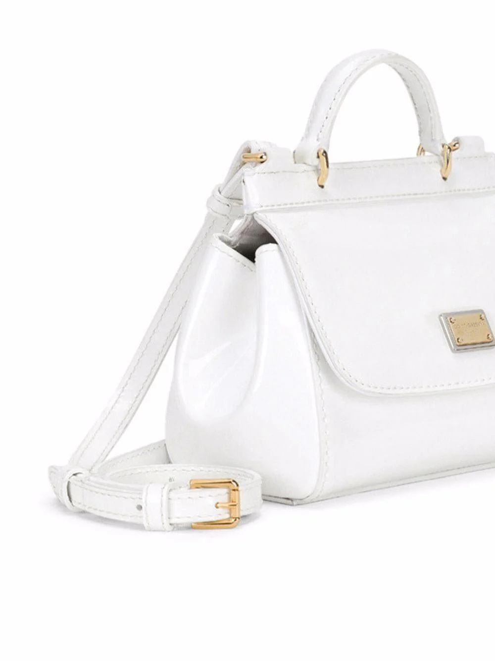 Borsa mini Sicily Dolce & Gabbana Kids, bianco, manica, tracolla regolabile e removibile, chiusura con calamita, scomparto unico, placca oro con logo sul davanti, fodera in seta.