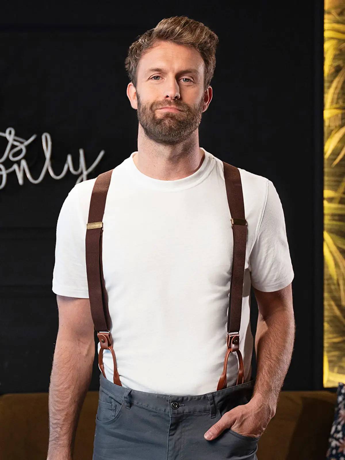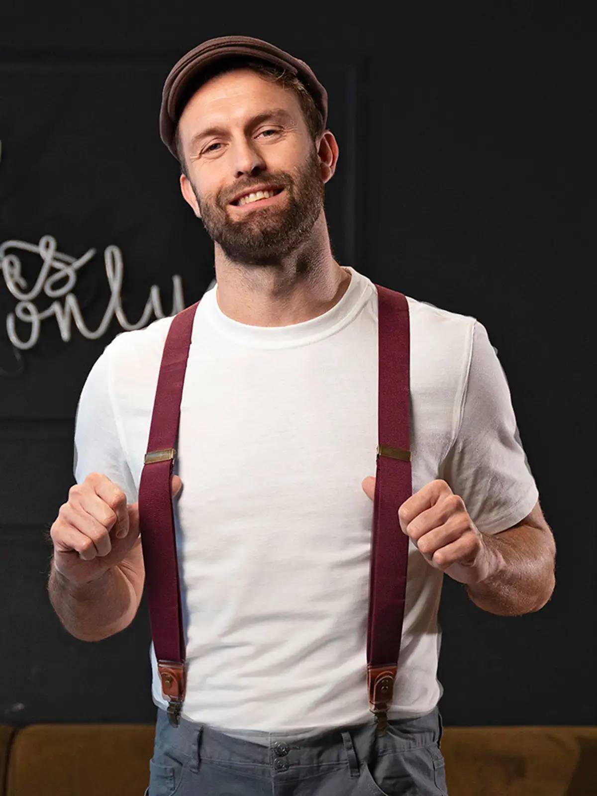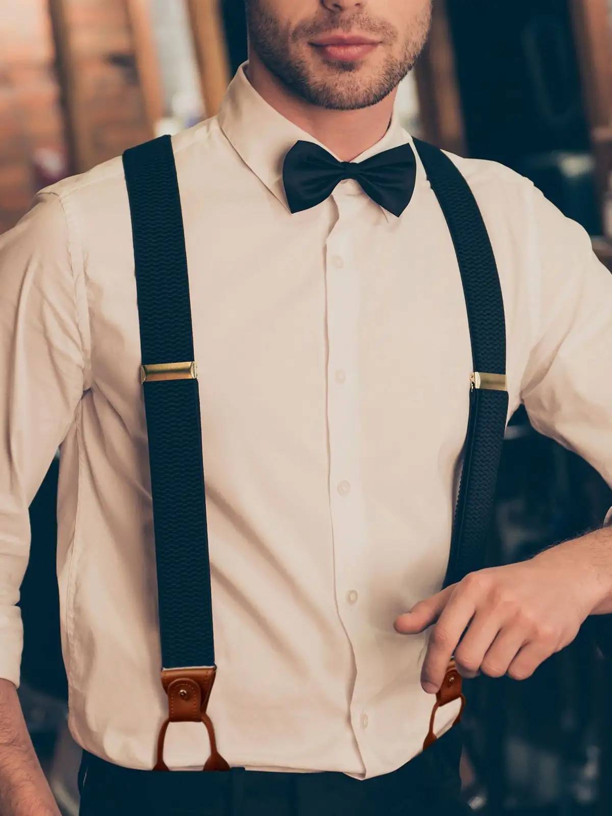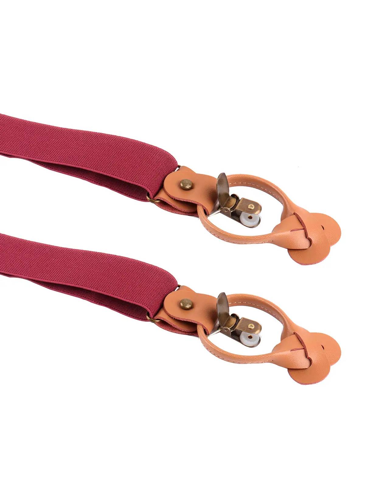 Bretelle urban-style in poliestere elasticizzato, inserti in vera pelle, clip in ottone anticato. Dimensioni 3,5cm x 120cm.
