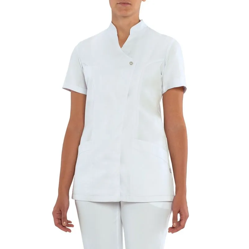 Elegante, aderente, ricca di dettagli e valorizzata dai contrasti di colore, con effetti di lucido opaco, la casacca Eliana è un classico modello trasversale. Realizzata in satin policotone easy care, adatta a lavaggi ad alte temperature, presenta un motivo a contrasto che si ripete nel solino, creando l’effetto doppio collo, con l’inserimento del profilo che incornicia tutte le parti. Il motivo si ripete nelle maniche e nelle tasche e l’abbottonatura, con solo automatico a vista, delinea la chiusura della casacca, rinforzata da un’impuntura. Immancabile il taschino sul petto e la sagomatura con due tagli nella parte posteriore, che avvita il capo al corpo.