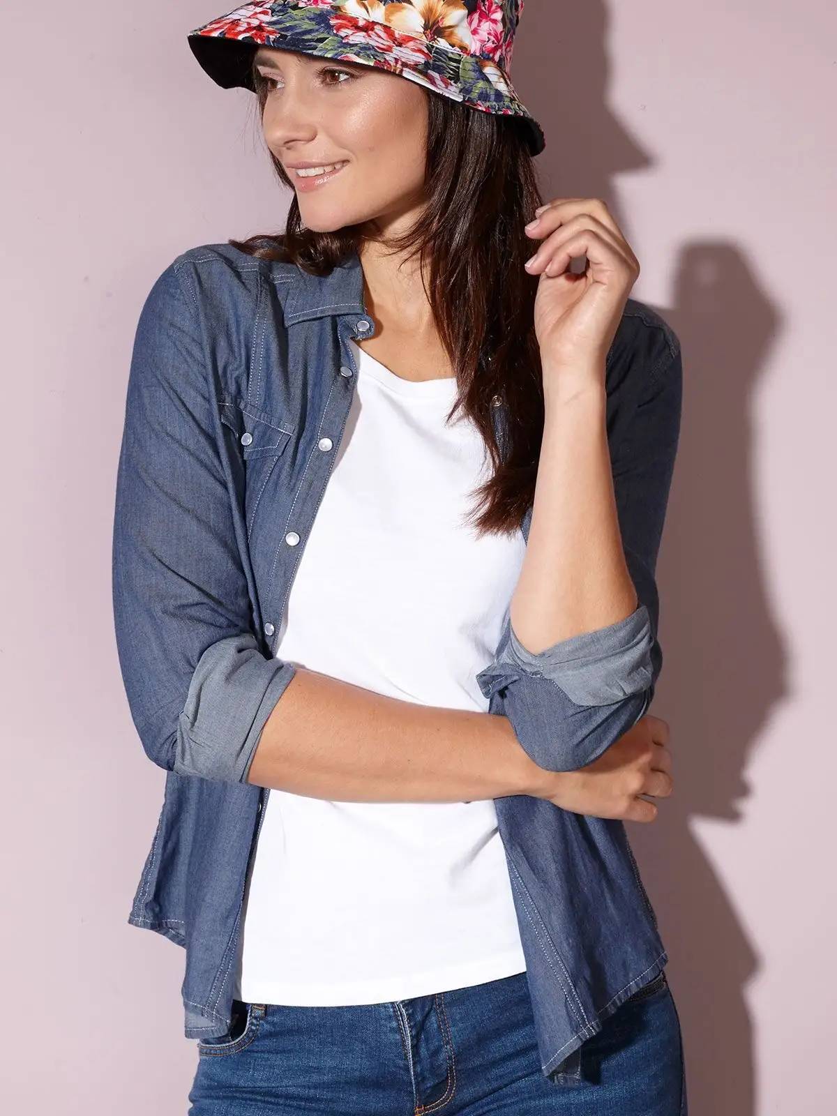 100% cotone pettinato. Camicia donna in tessuto denim, sprone classico sul retro, due taschine interne, impunture marcate, orlo arrotondato, Leggermente sfiancata ai lati.