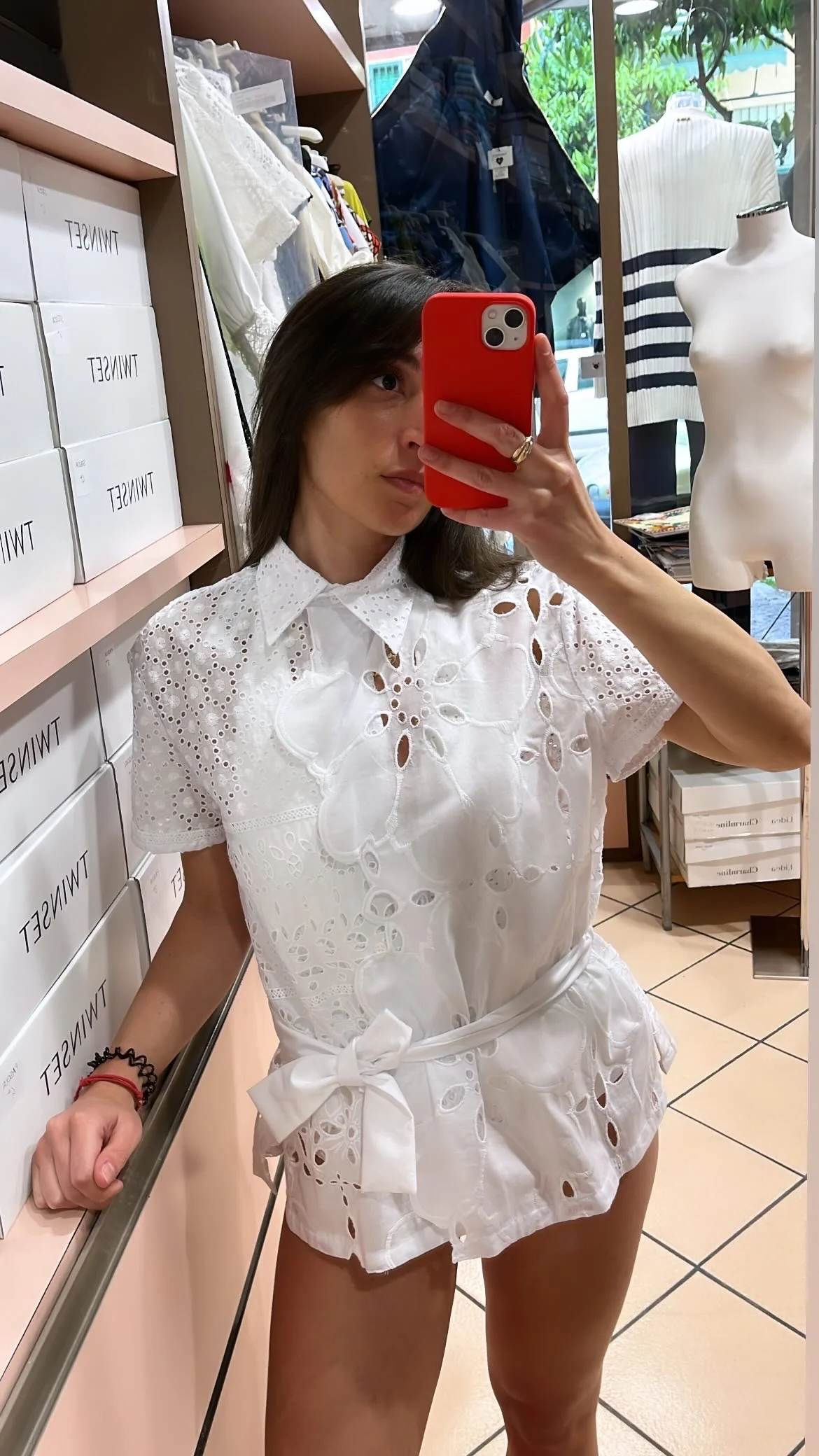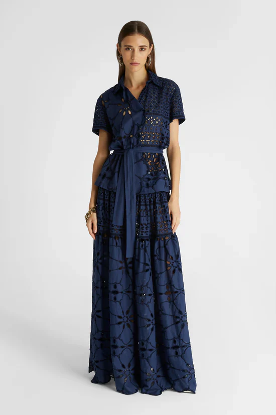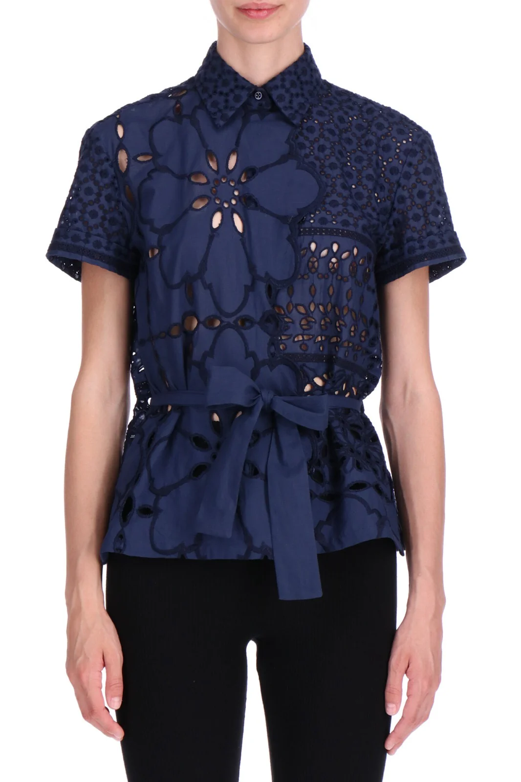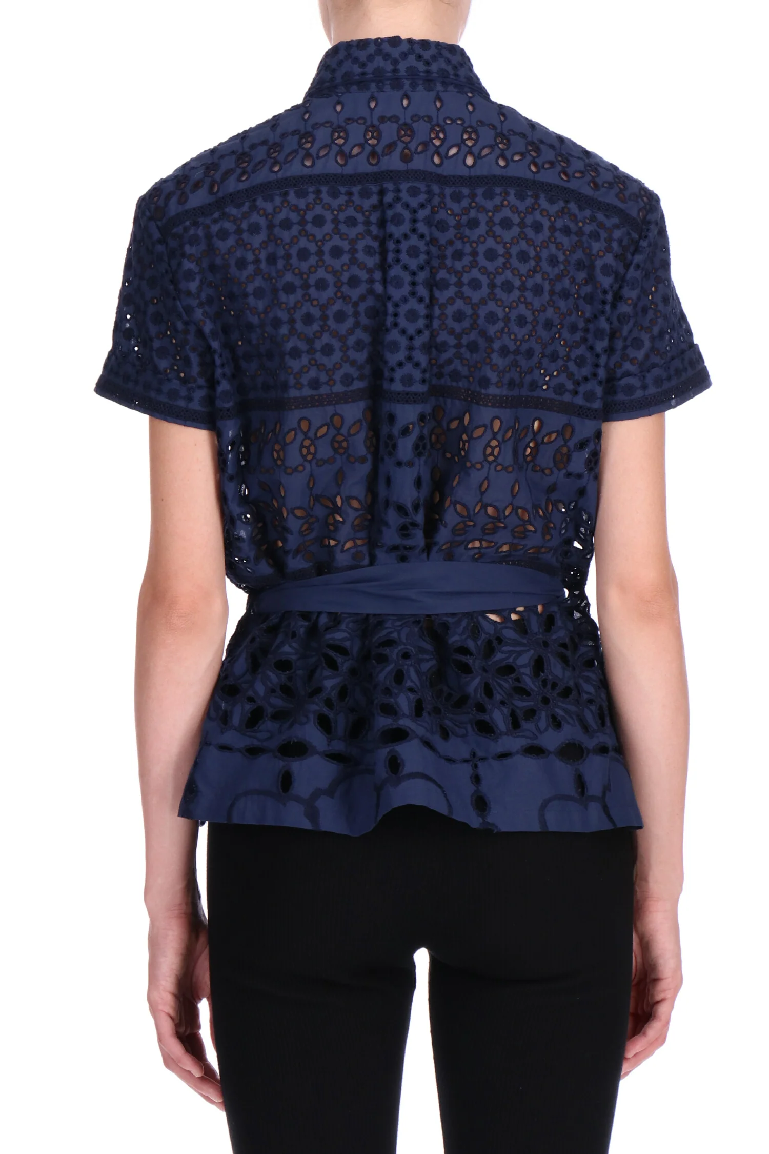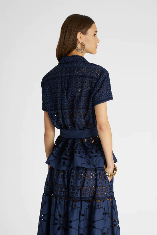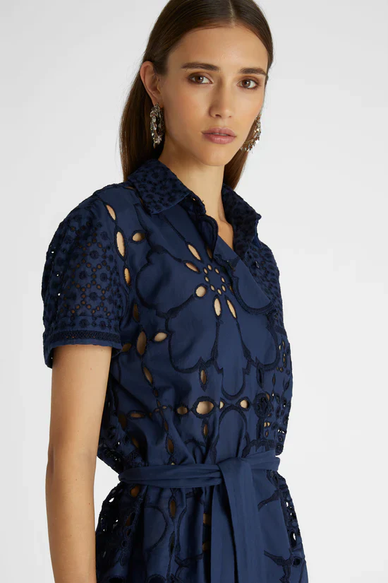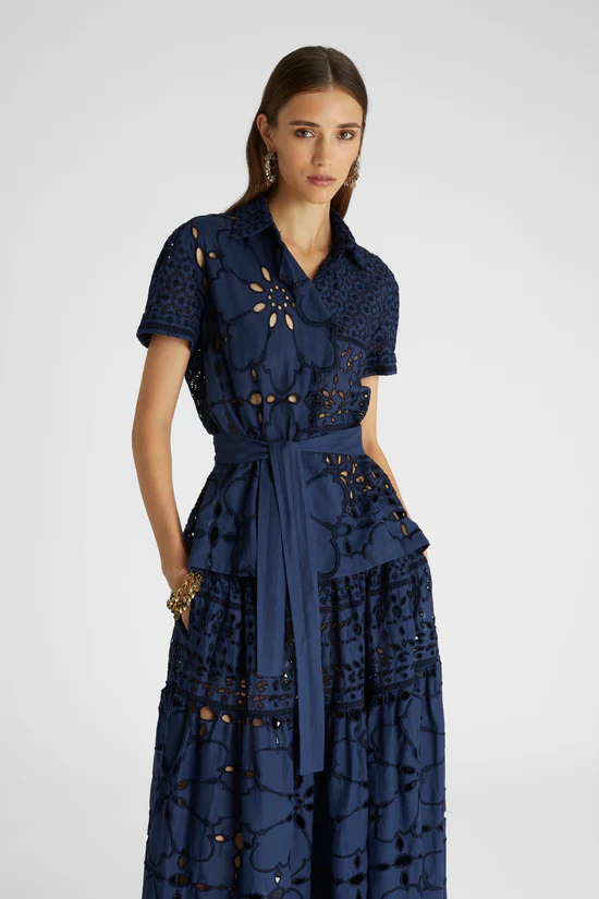 Camicia manica corta completamente realizzata in sangallo, puro cotone. La camicia presenta una piccola fusciacca di mussola in tinta unita per esaltare il punto vita