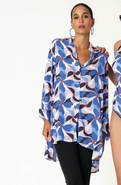 Camicia lunga fantasia floreale in leggerissimo tessuto di viscosa.. Ha la manica lunga con polsino e un gioco di diverse lunghezze sul fondo. Vestibilità over Prodotto fatto con cura in Italia