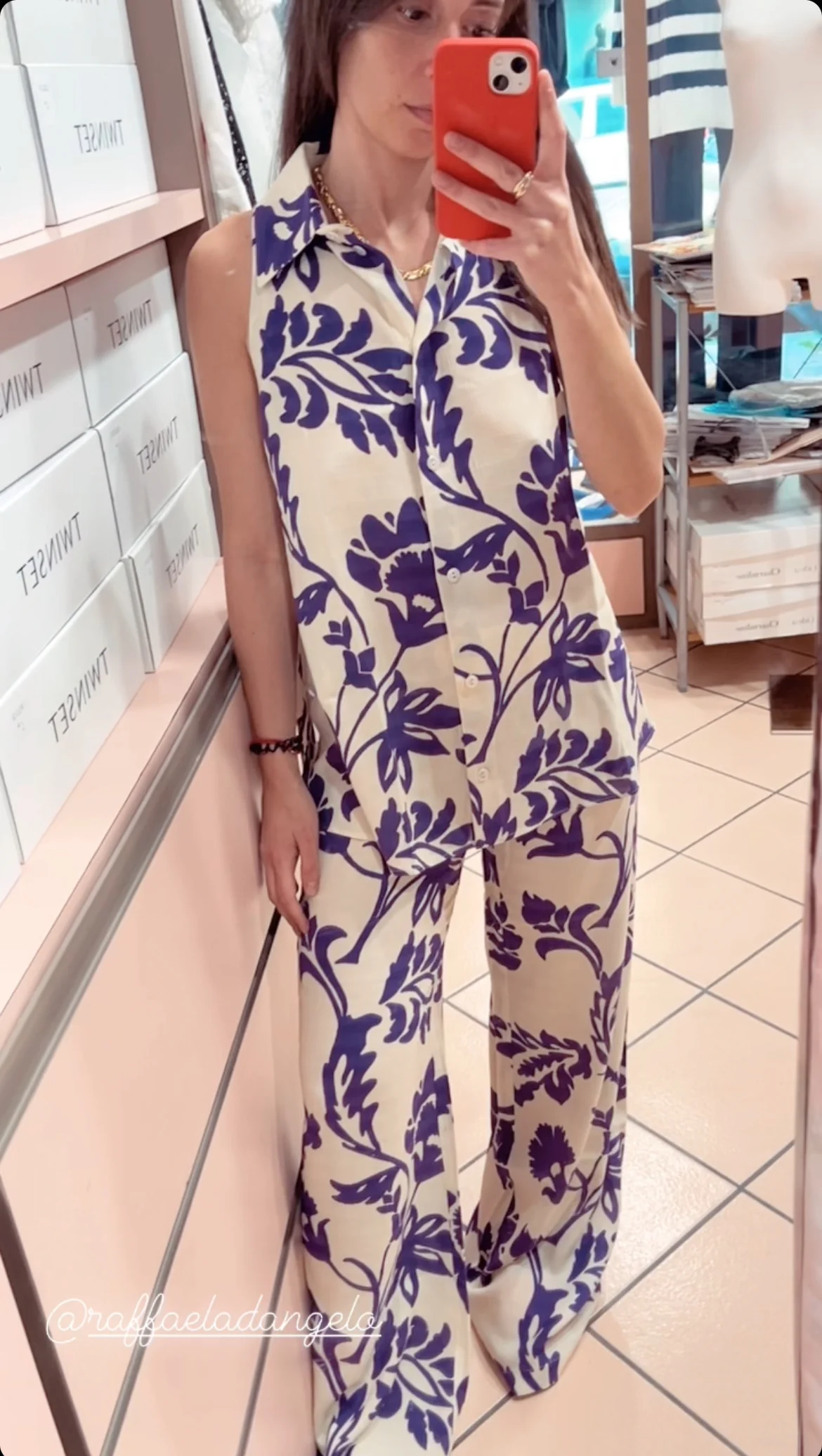 Camicia smanicata in leggerissimo tessuto di viscosa stampa floreale. Ha un taglio della manica all’americana, una linea svasata e spacchi laterali. E’ coordinanile con il pantalone palazzo della stessa fantasia come da foto