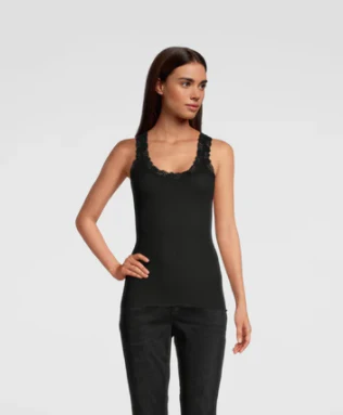 Canotta Spalla Larga in Lana-Seta a Costine con Pizzo di OscalitoProfilo in Pizzo Lungo lo Scollo e il Giromanica. Tessuto 70% Lana 30% Seta Colore: Avorio, Nero Made in Italy
