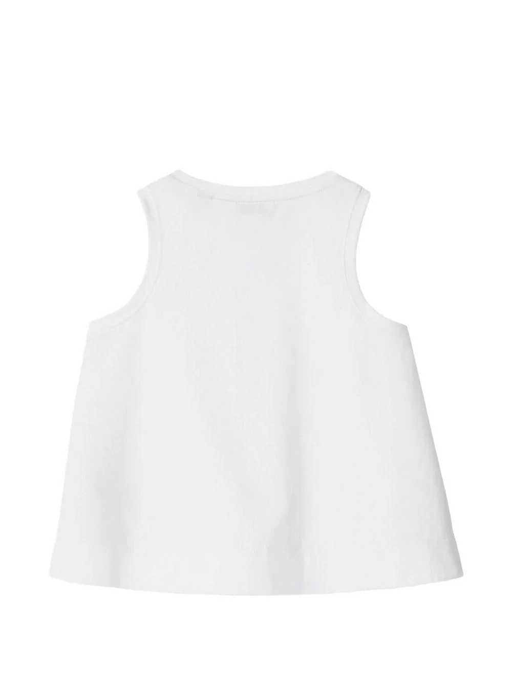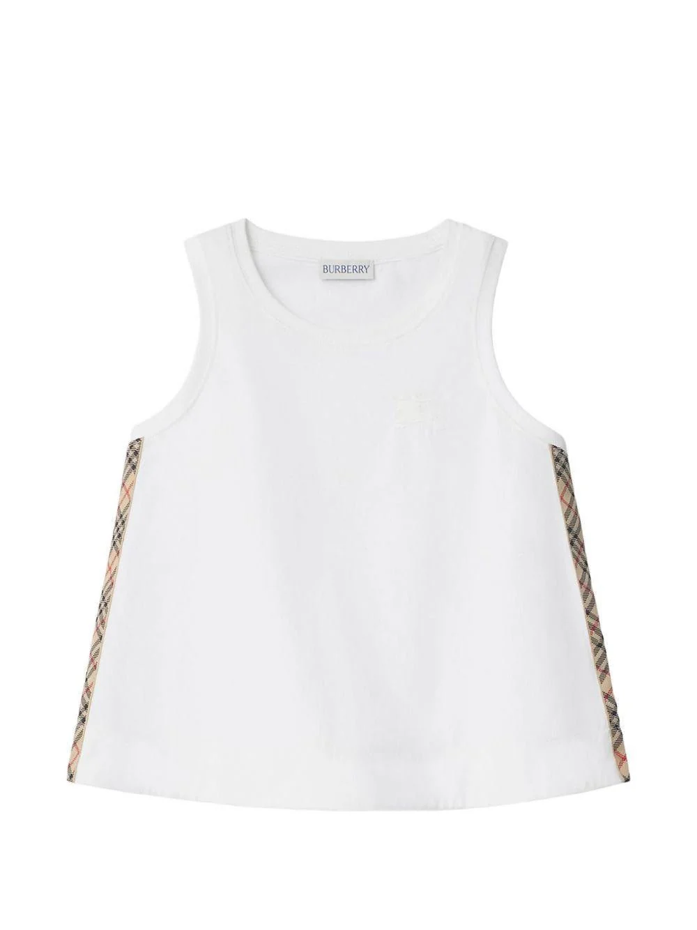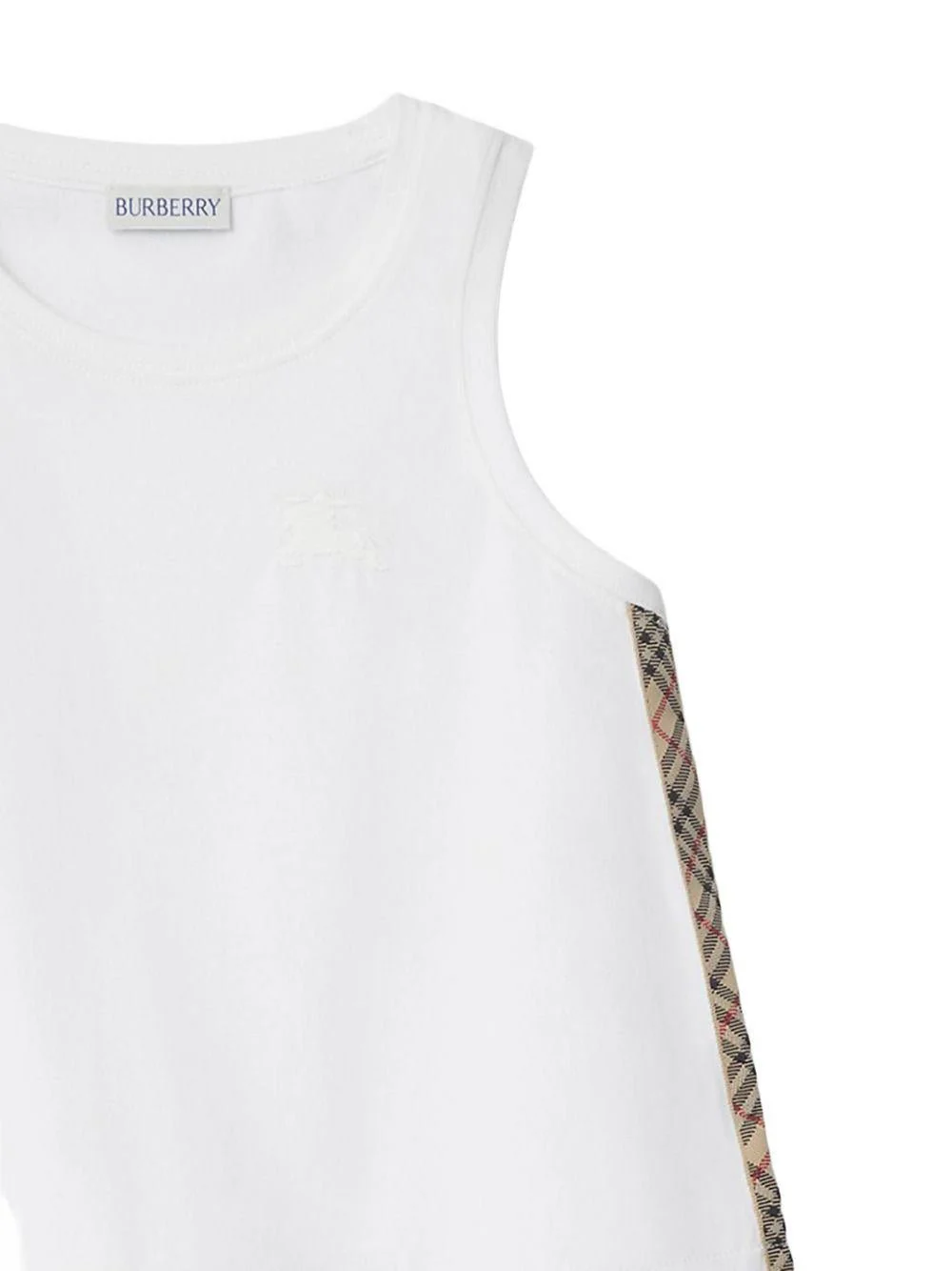 Canotta Burberry Kids, bianco, scollo rotondo, senza maniche, bordi laterali con motivo check.