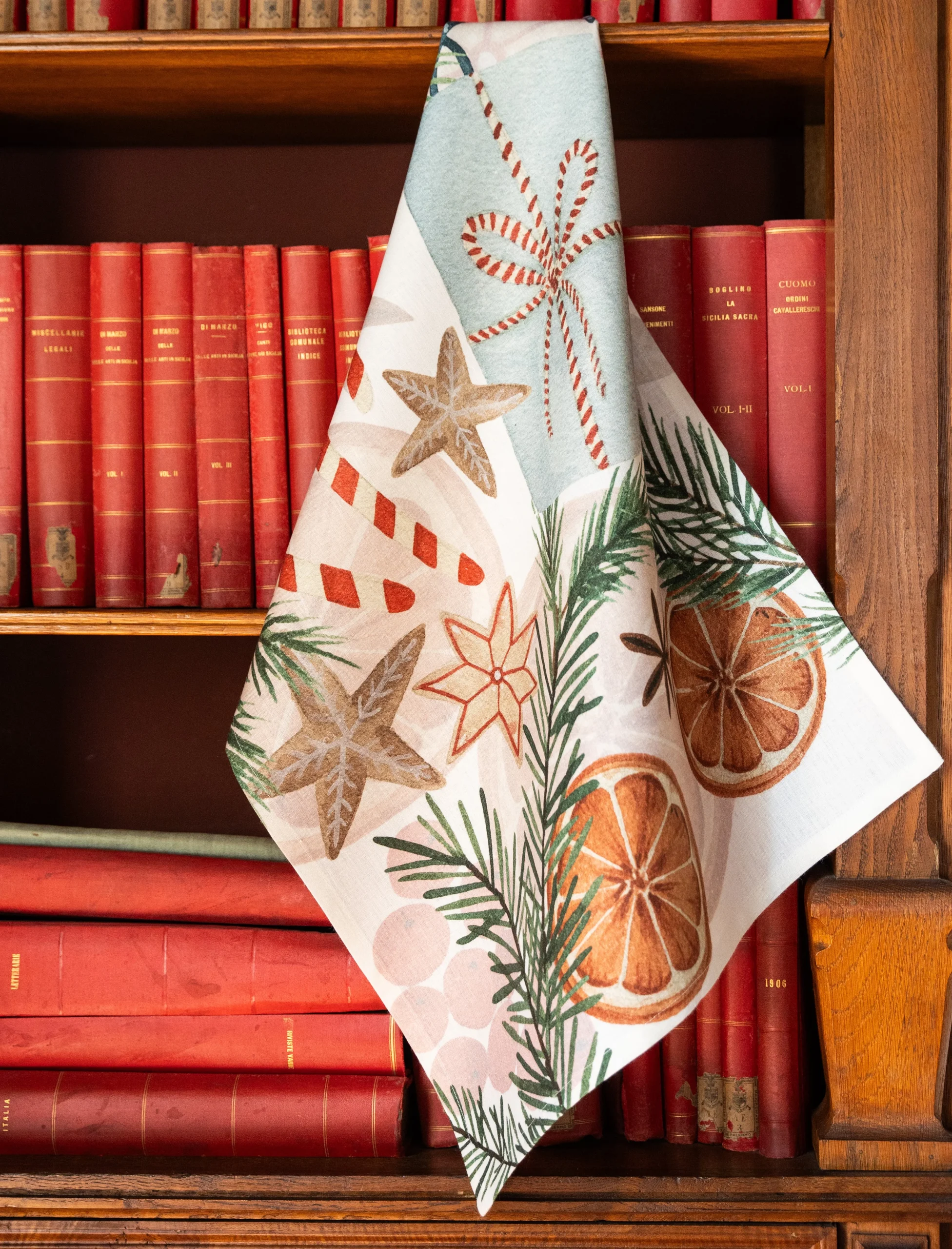Asciugapiatti in puro lino stampato con motivi natalizi.