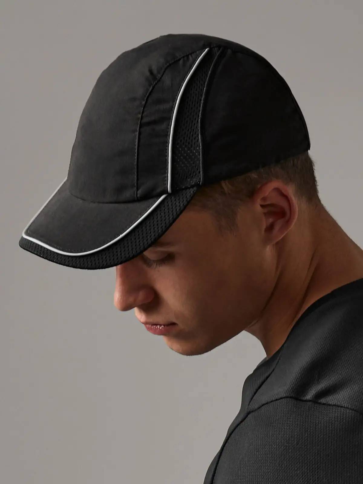 100% poliestere-microfibra. Cappellino dotato di pannello frontale senza cuciture e centralizzato, bande traforate ai lati e inserti fluorescenti, chiusura in velcro a strappo, taglia unica.