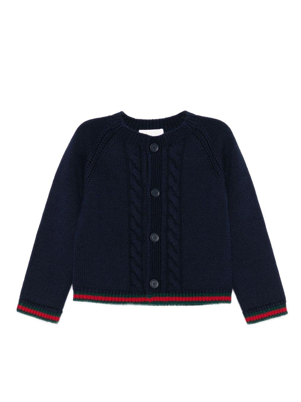 Cardigan Gucci Kids, blu, lavorato a maglia con design a trecce, maniche lunghe, bordi a contrasto, chiusura con bottoni.