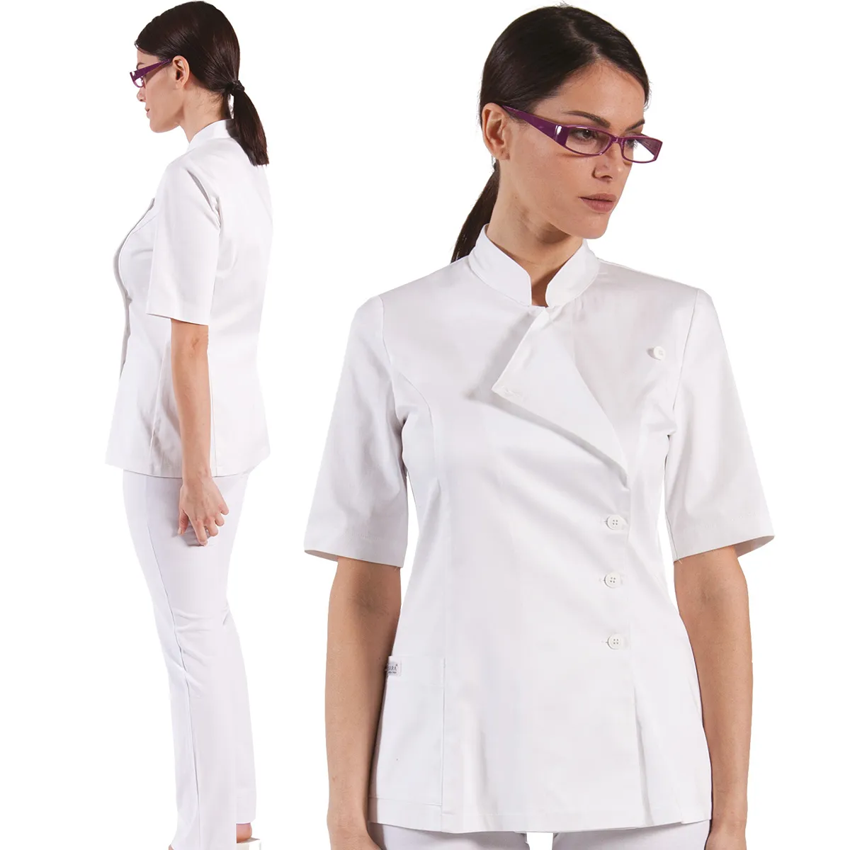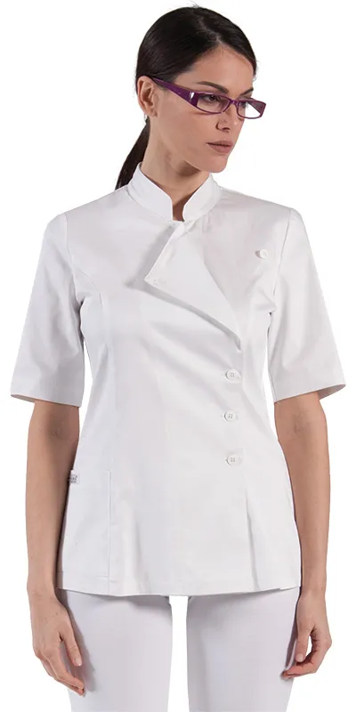 Casacca donna manica corta, collo alla coreana e allacciatura laterale con bottoni, una tasca.