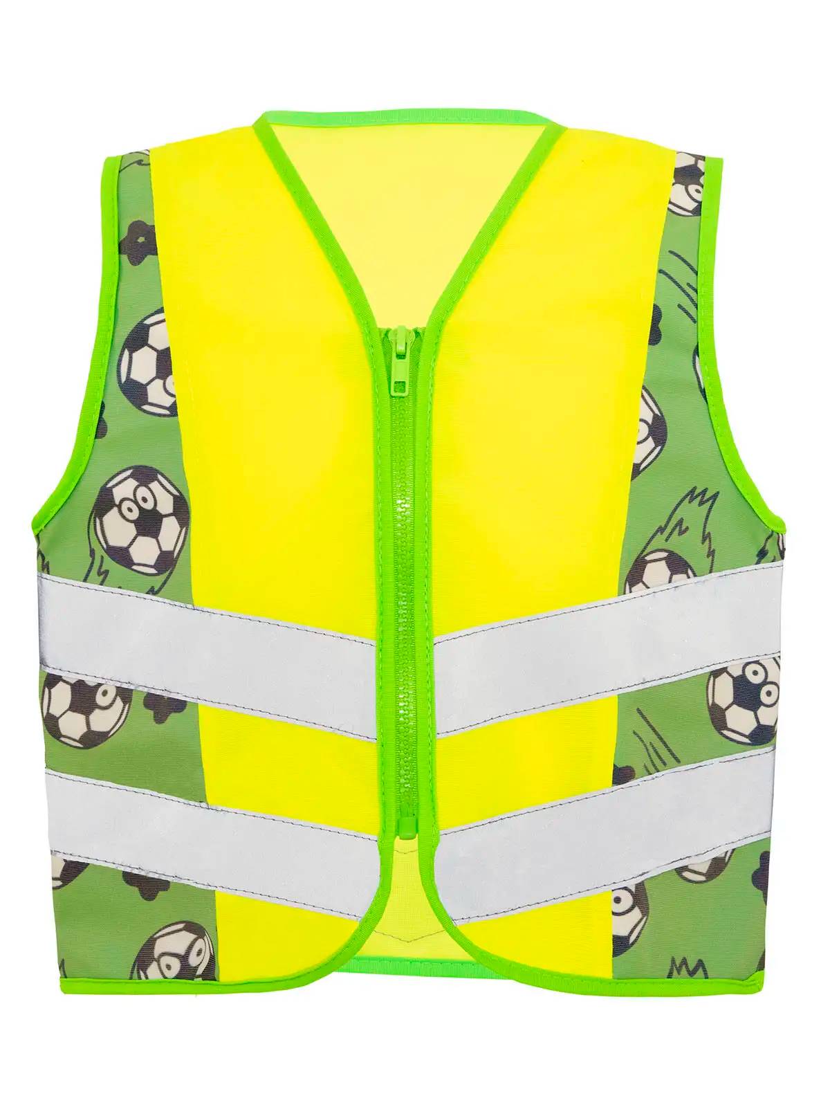 1100% poliestere. Gilet ad alta visibilità per bambini con disegni sportivi, alta visibilità grazie al tessuto leggero a fantasia con rivestimento riflettente e strisce riflettenti, chiusura con pratica cerniera. certificato secondo la norma EN 17353