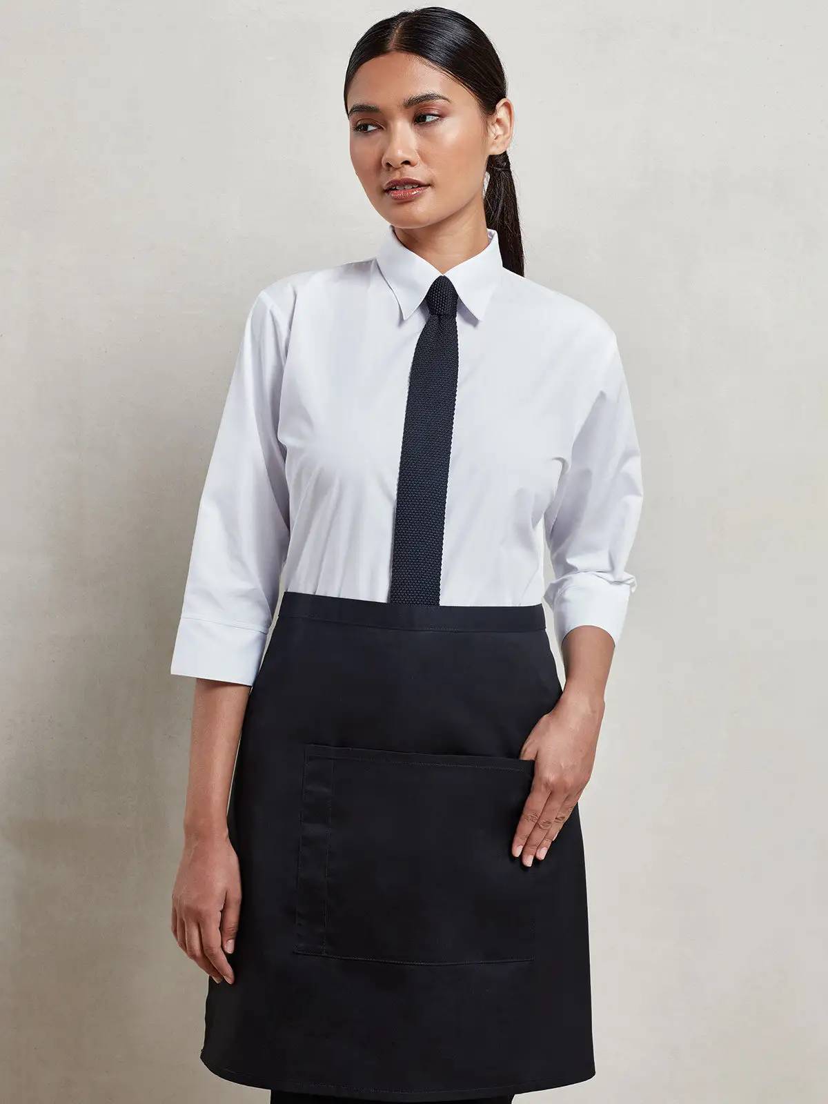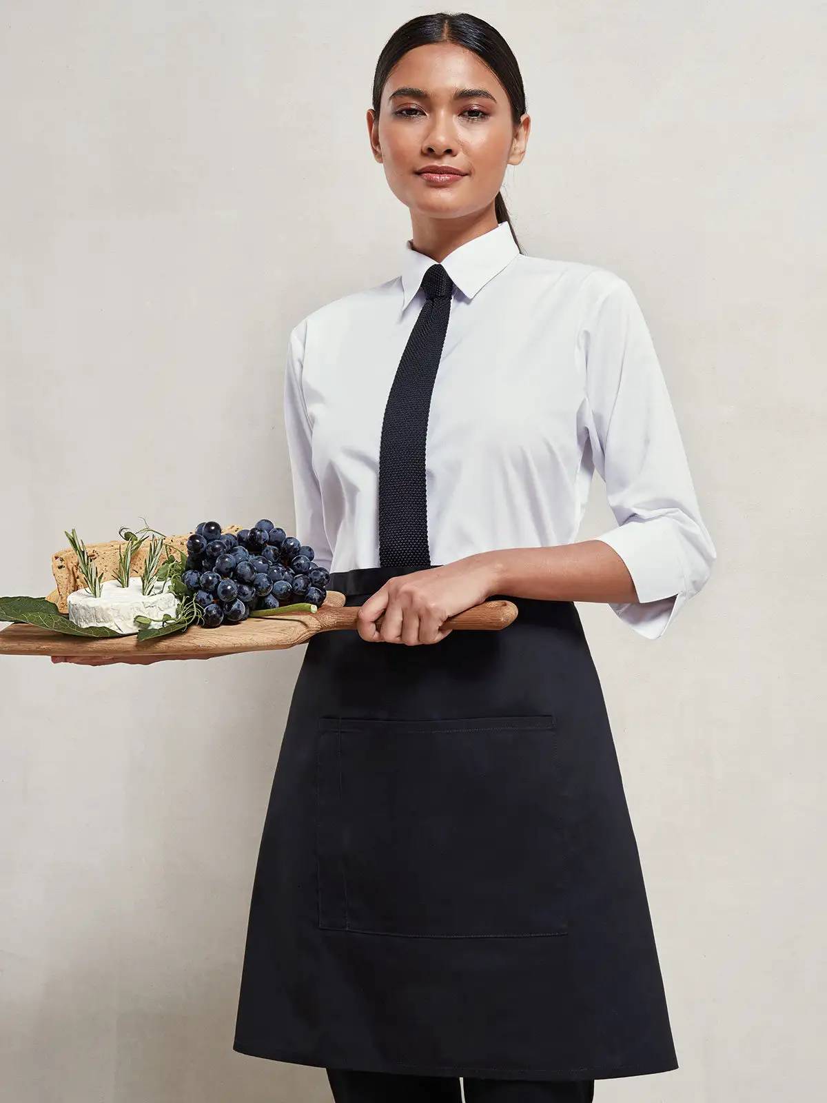 65% Poliestere riciclato, 35% Cotone. Grembiule a vita in policotone riciclato, di lunghezza media, tasca centrale larga 23 cm e lunga 22 cm, taschino integrato per la penna, lacci dello stesso tessuto, larghezza 70 cm, lunghezza 50 cm. Denim: 70% Cotone, 30% Poliestere riciclato 265gr.